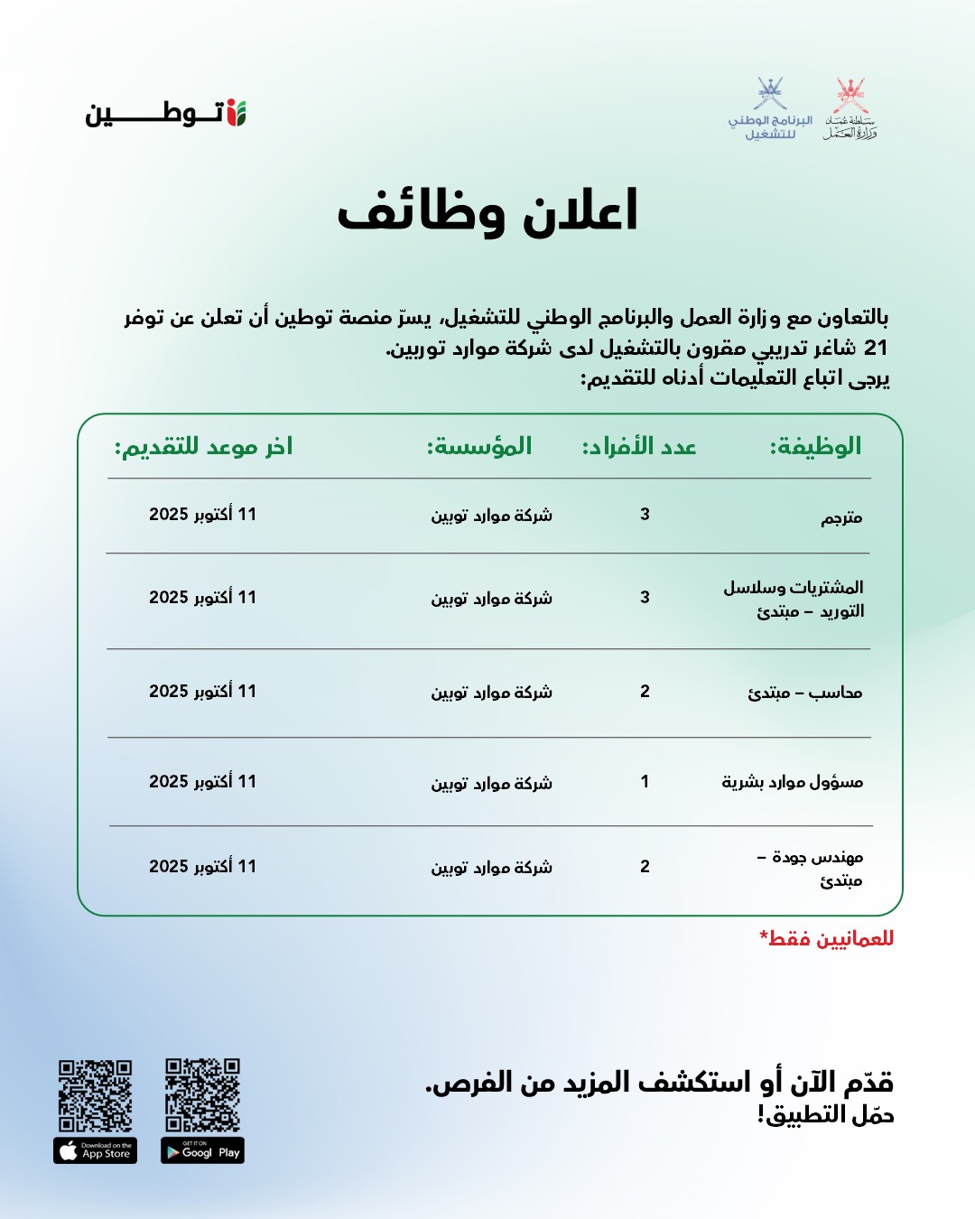 منصة توطين - توفر 21 شاغر تدريبي مقرون بالتشغيل لدى شركة موارد توربين