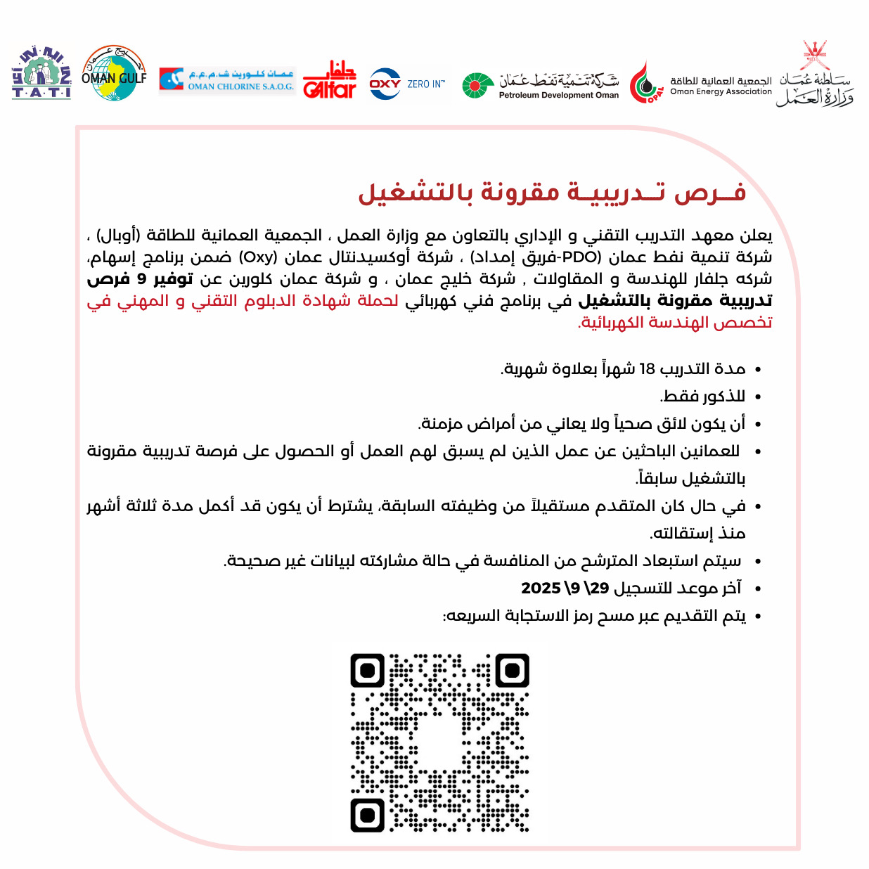 معهد التدريب التقني والإداري - 9 فرص تدريبية مقرونة بالتشغيل في برنامج فني كهربائي لحملة شهادة الدبلوم التقني و المهني