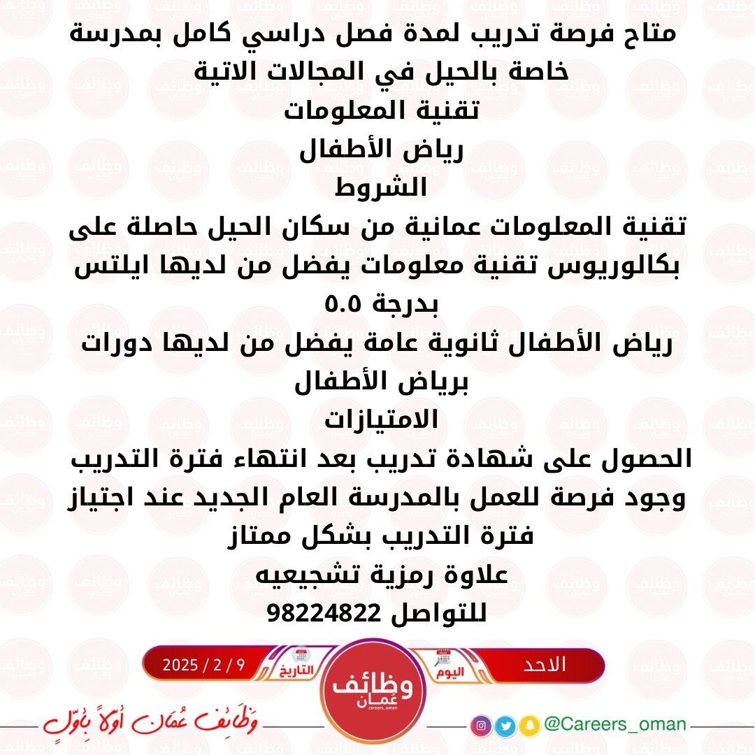 مدرسة خاصة في الحيل - فرصة تدريبية لمدة فصل دراسي كامل مع علاوة ( مجالات التدريب تقنية المعلومات ورياض الأطفال )
