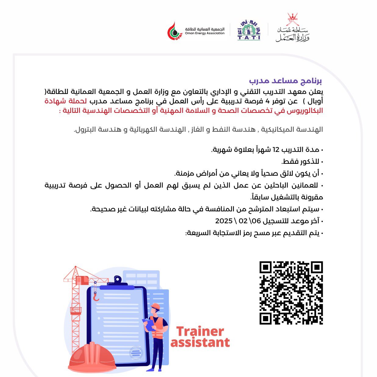 معهد التدريب التقني والإداري بالتعاون مع وزارة العمل والجمعية العمانية للطاقة ( أوبال ) - 4 فرصة تدريبية على رأس العمل في برنامج مساعد مدرب