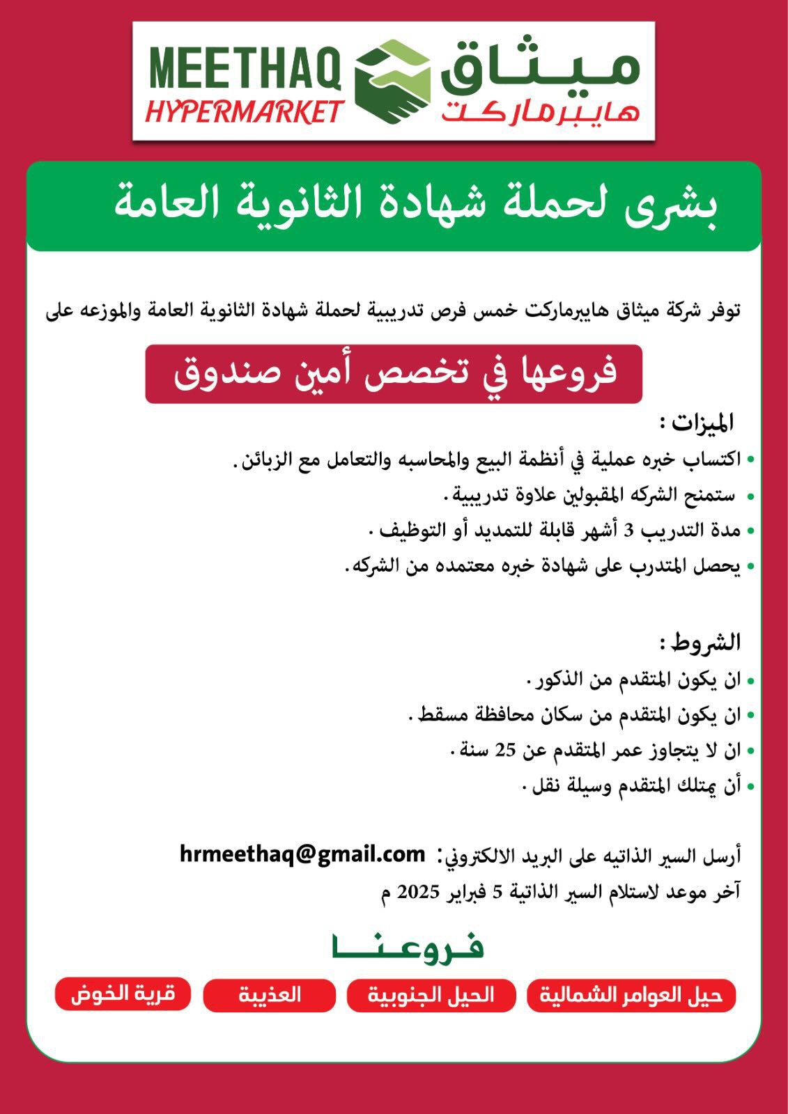 شركة ميثاق هايبر ماركت - توفر 5 فرص تدريبية لمدة 3 أشهر مع علاوة ( مجال التدريب أمين صندوق )