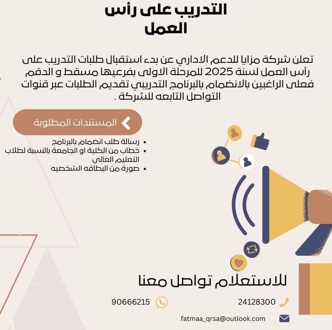 شركة مزايا للدعم الاداري عن بدء استقبال طلبات التدريب على رأس العمل