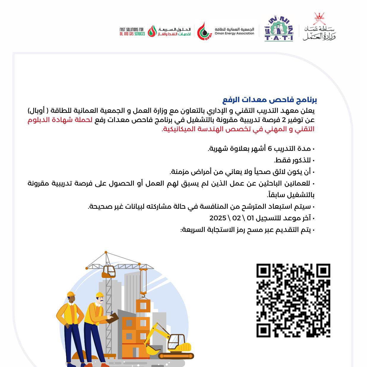 معهد التدريب التقني والإداري بالتعاون مع وزارة العمل و الجمعية العمانية للطاقة ( أوبال) - توفير 2 فرصة تدريبية مقرونة بالتشغيل في برنامج فاحص معدات رفع