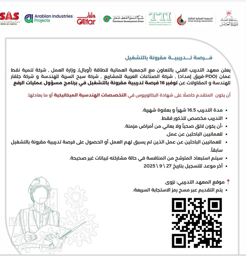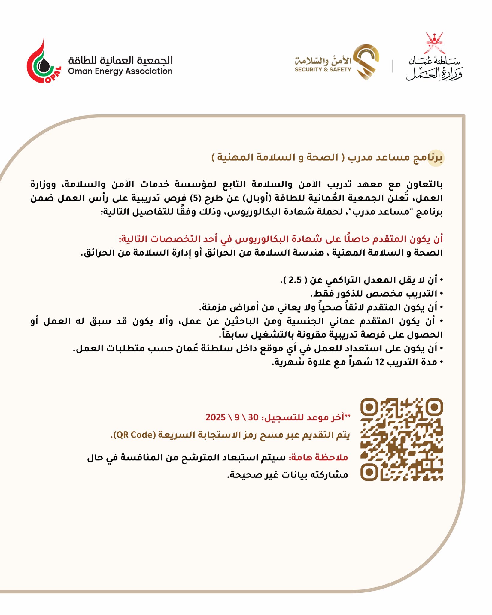 بالتعاون مع معهد تدريب الأمن والسلامة التابع لمؤسسة خدمات الأمن والسلامة، ووزارة العمل، تعلن الجمعية العُمانية للطاقة (أوبال) عن فتح باب التسجيل في برنامج "مساعد مدرب" بنظام التدريب على رأس العمل، لحملة شهادة البكالوريوس