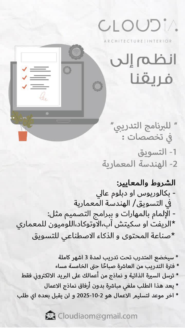 مكتب كلاوديا للتصميم الداخلي والمعماري في العذيبة - فرص تدريبية لمدة 3 أشهر في تخصصات ( التسويق + الهندسة المعمارية )