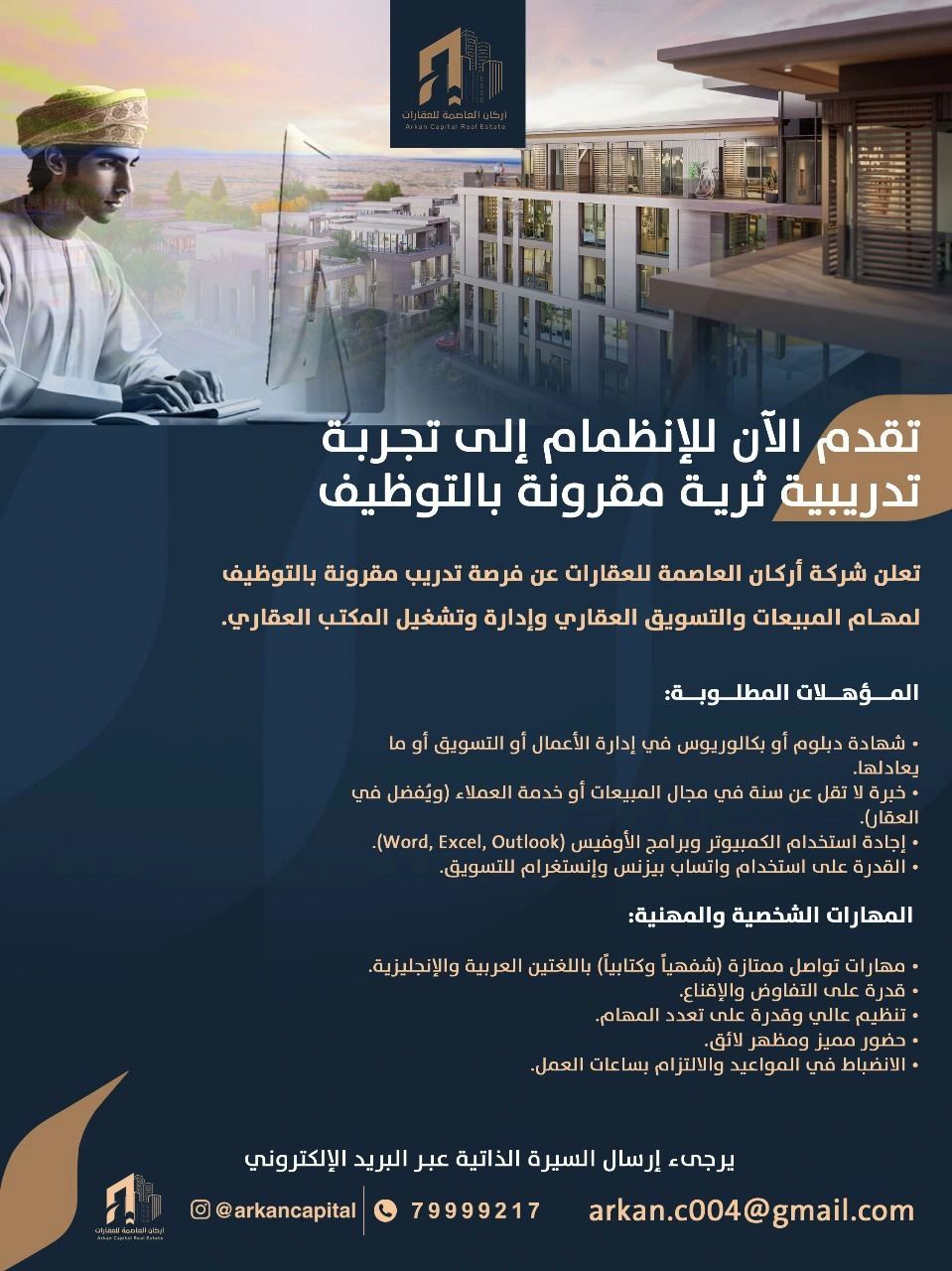 شركة أركان العاصمة للعقارات - فرصة تدريب مقرونة بالتوظيف لمهام المبيعات والتسويق العقاري وإدارة وتشغيل المكتب العقاري