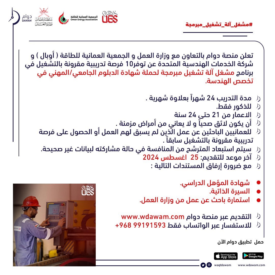 منصة دوام بالتعاون مع شركة الخدمات الهندسية المتحدة - توفر 10 فرصة تدريبية مقرونة بالتشغيل في برنامج مشغل آلة تشغيل مبرمجة