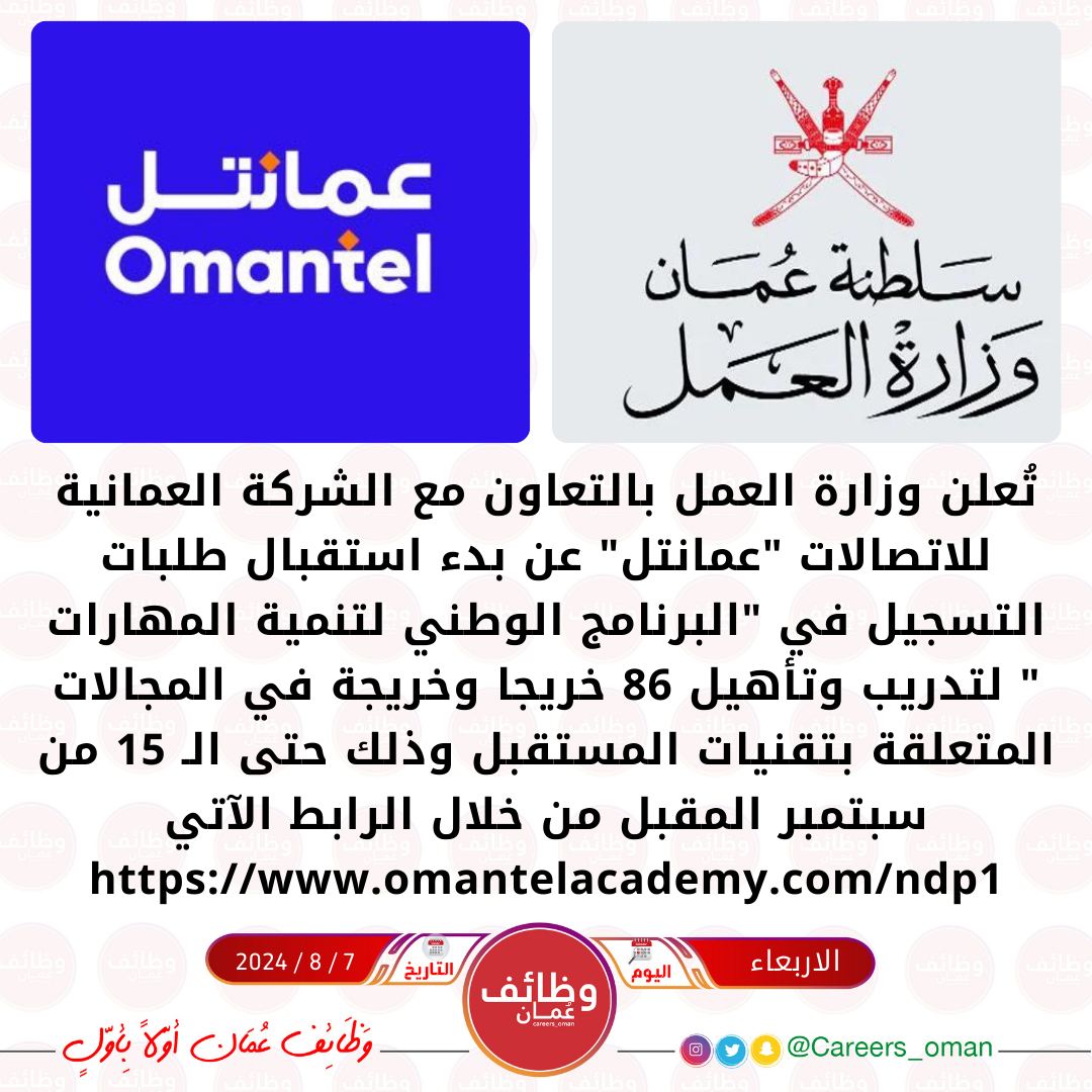 شركة عمانتل - البرنامج الوطني لتنمية المهارات لتدريب وتأهيل 86 خريجا وخريجة في المجالات المتعلقة بتقنيات المستقبل