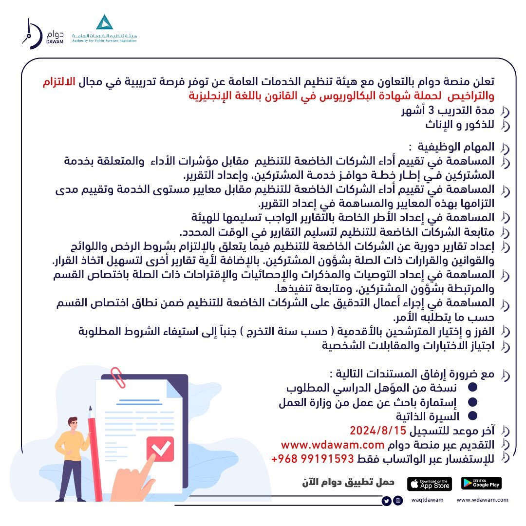منصة دوام بالتعاون مع هيئة تنظيم الخدمات العامة - توفر فرصة تدريبية في مختلف المجالات لحملة شهادة البكالوريوس