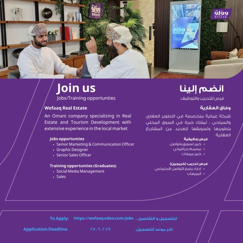 وفاق العقارية - فرص وظيفية ( خبير تسويق وتواصل - مصمم جرافيكي - خبير مبيعات ) وفرص تدريبية في ( إدارة برامج التواصل الاجتماعي - المبيعات )