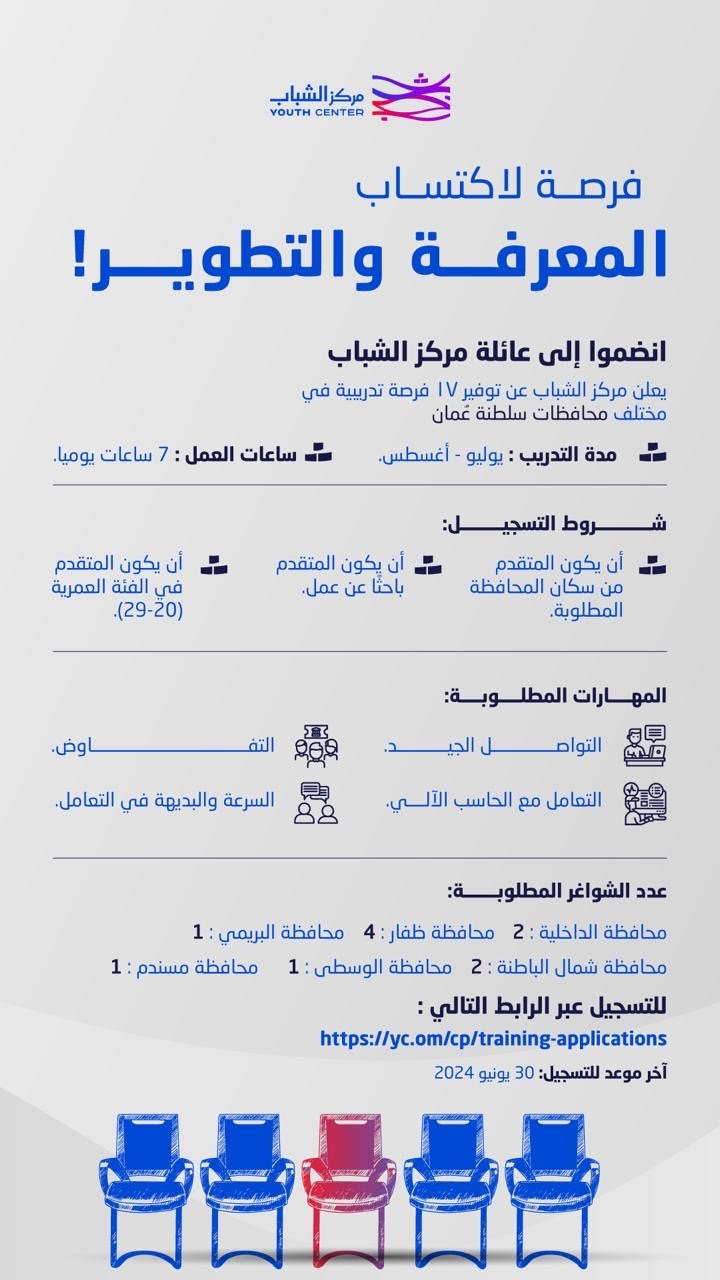 مركز الشباب - 17 فرصة تدريبية في مختلف المحافظات