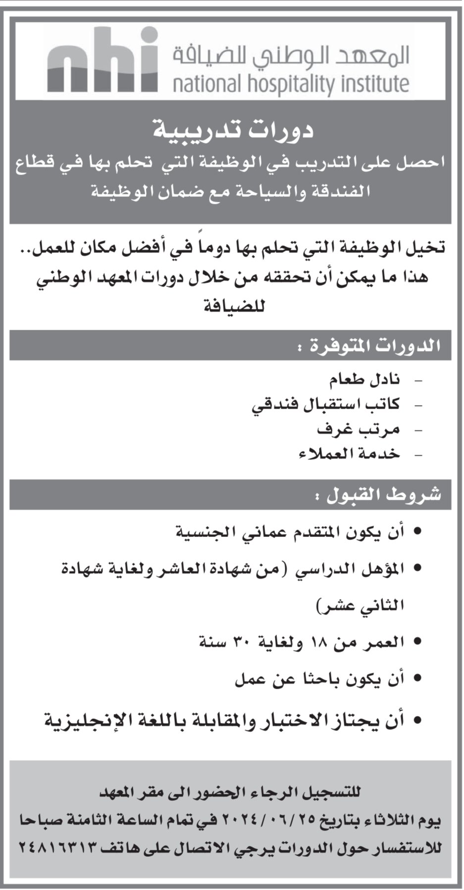 المعهد الوطني للضيافة - فرص تدريبية جديدة