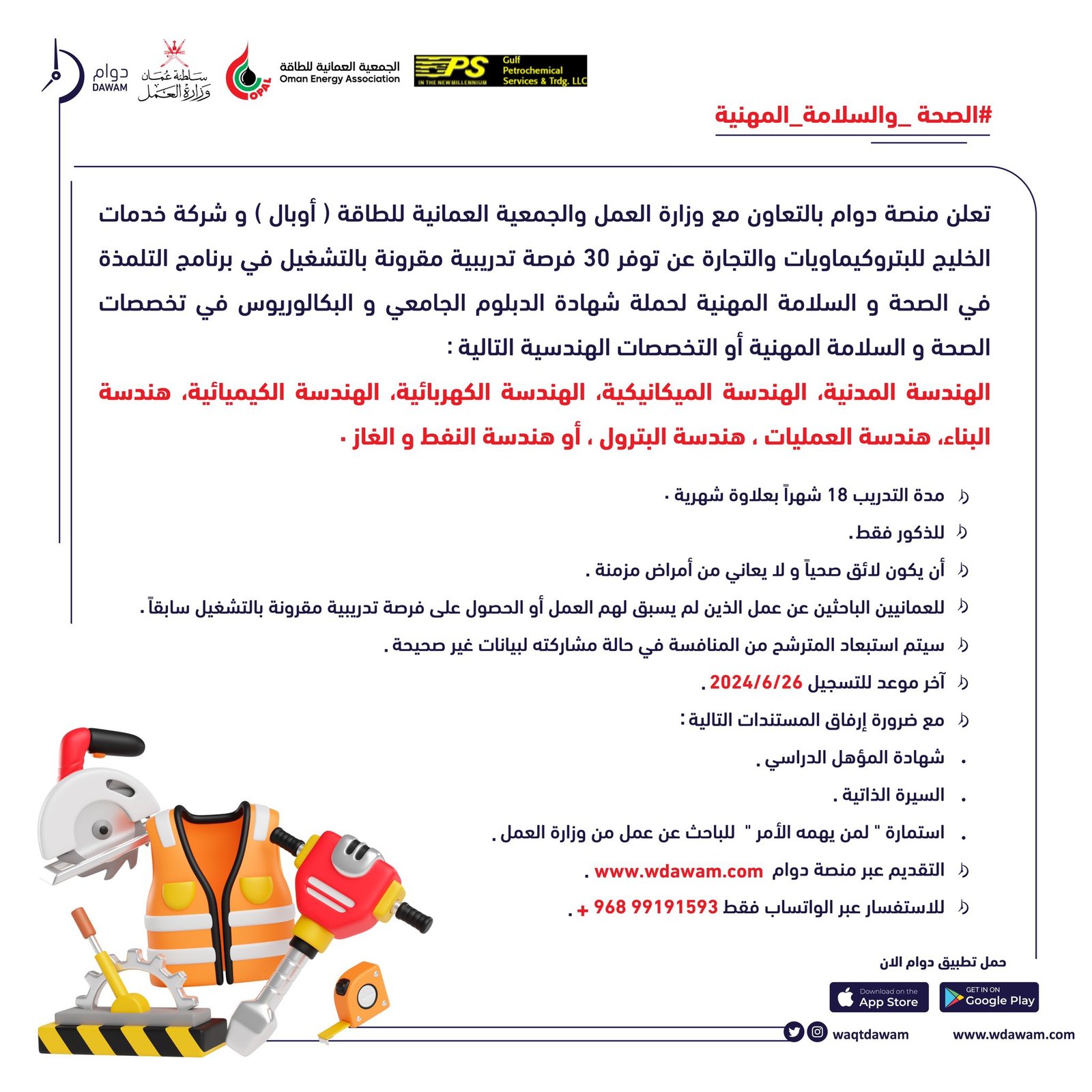 منصة دوام بالتعاون مع وزارة العمل والجمعية العمانية للطاقة (أوبال) وشركة خدمات الخليج للبتروكيماويات عن توفر فرص تدريب مقرون بالتشغيل في مجال الصحة و السلامة المهنية