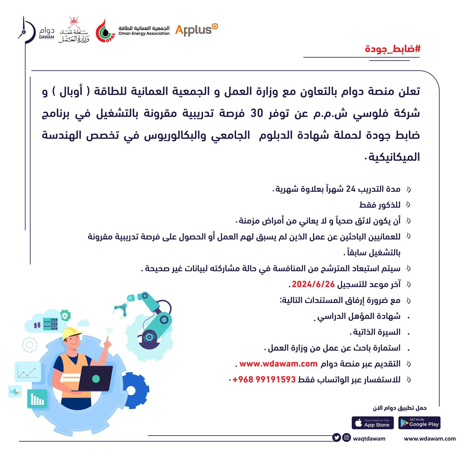 منصة دوام بالتعاون مع وزارة العمل والجمعية العمانية للطاقة (أوبال) وشركة فلوسي عن توفر فرص تدريب مقرون بالتشغيل في مجال ضابط جودة