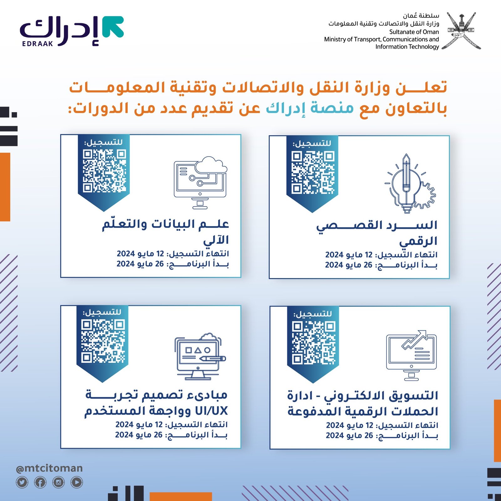 وزارة النقل والاتصالات وتقنية المعلومات - تقديم عدد من الدورات بالتعاون مع منصة إدراك