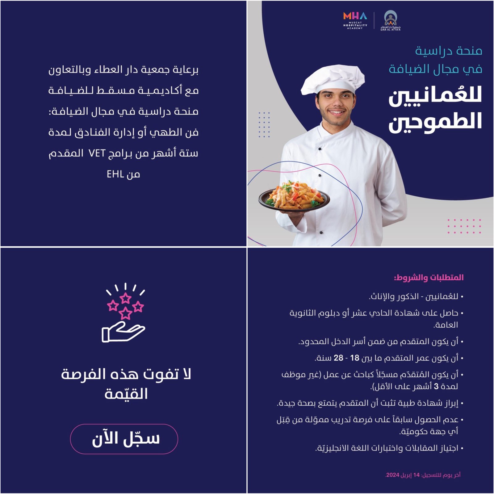 جمعية دار العطاء وبالتعاون مع أكاديمية مسقط للضيافة - منحة دراسية في مجال الضيافة لمدة 6 أشهر