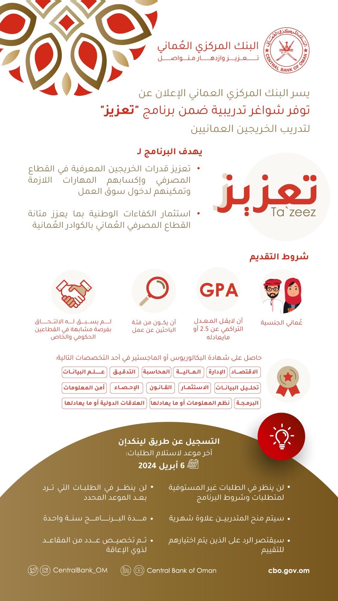 البنك المركز العماني - شواغر تدريبية ضمن برنامج ( تعزيز ) لتدريب الخريجين