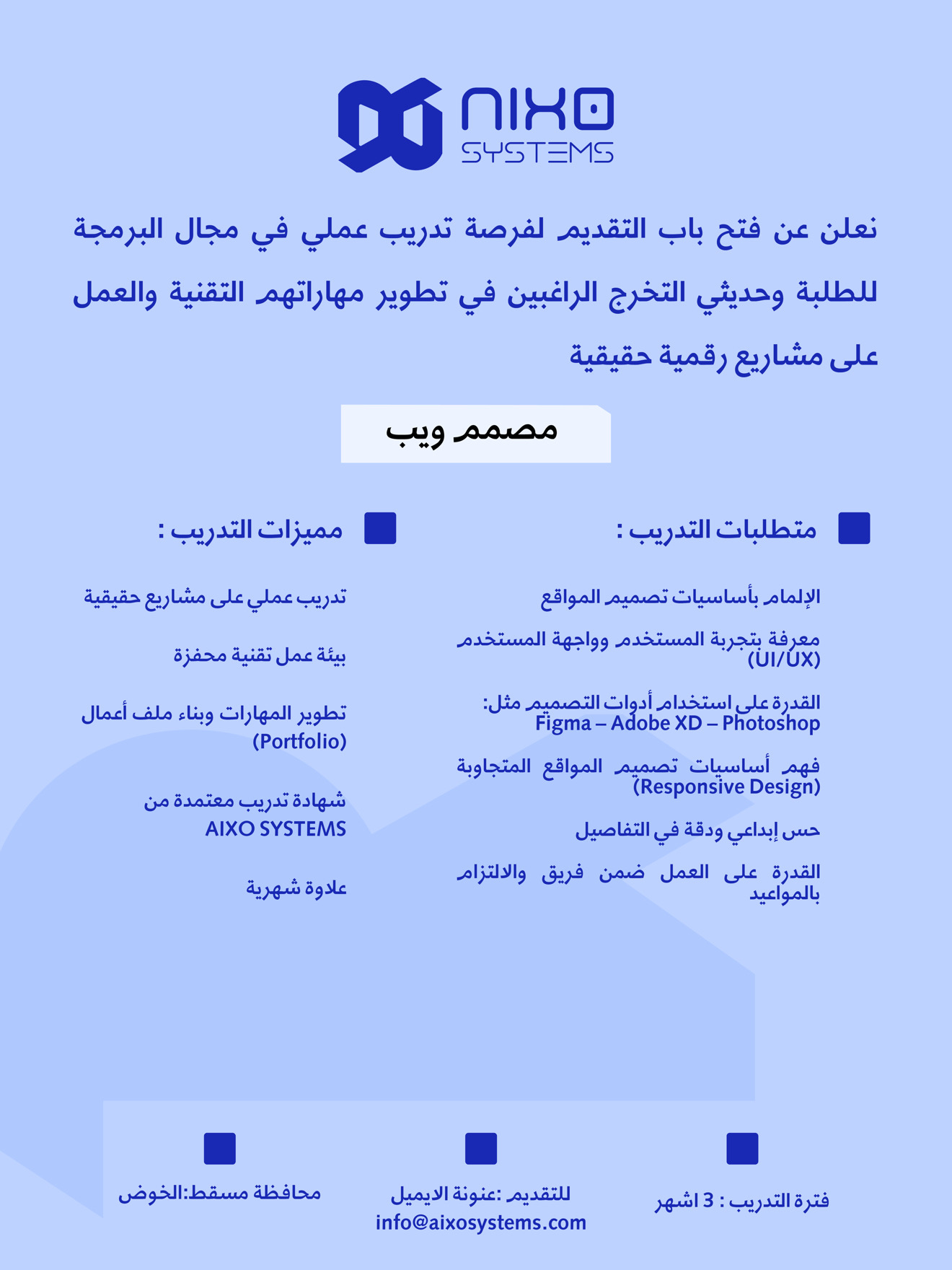 شركة AIXO SYSTEMS في الخوض - فرصة تدريب عملية لمدة 3 أشهر في مجال البرمجة للطلبة وحديثي التخرج ( مصمم ويب + التصميم الجرافيكي + البرمجة )