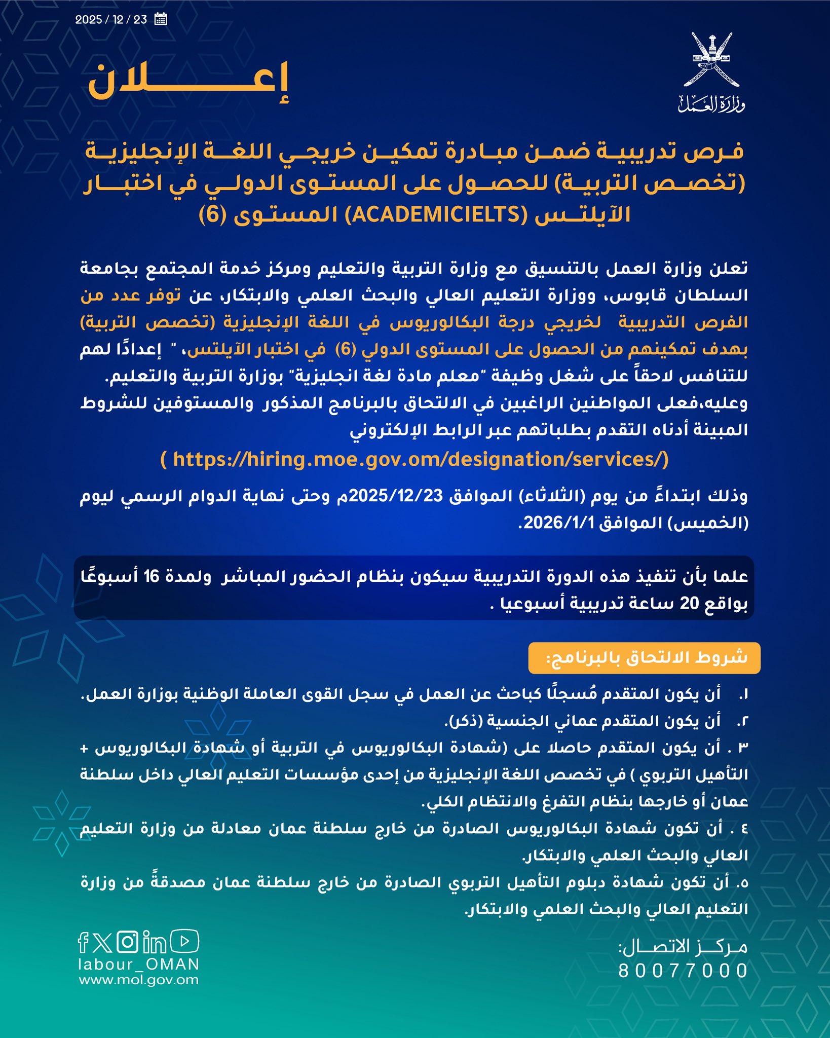 وزارة العمل بالتنسيق مع وزارة التربية والتعليم ومركز خدمة المجتمع بجامعة السلطان قابوس - توفر عدد من الفرص التدريبية لخريجي درجة البكالوريوس في اللغة الإنجليزية (تخصص التربية)