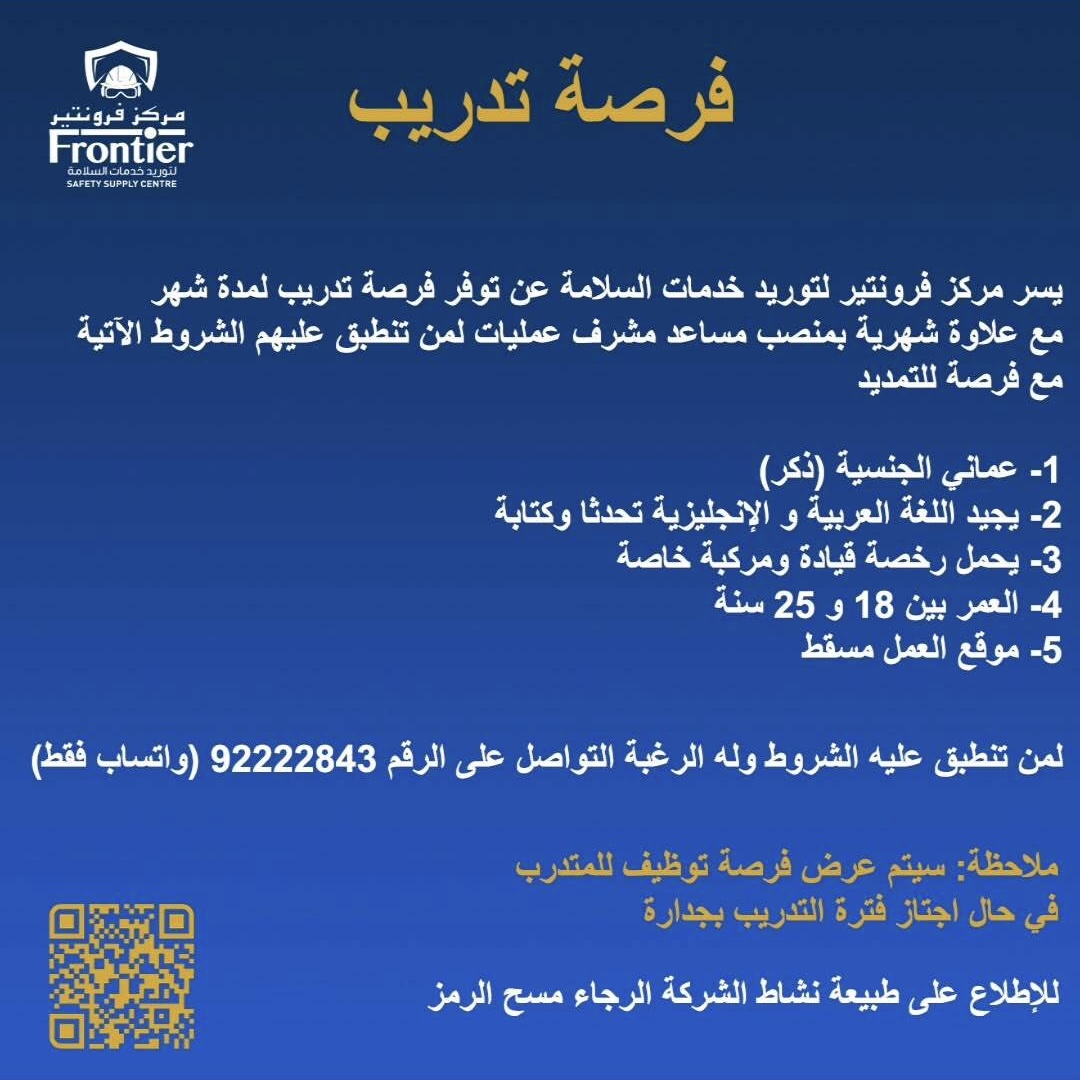 مركز فرونتير لتوريد خدمات السلامة في مسقط - توفر فرصة تدريب لمدة شهر مع علاوة شهرية بمنصب مساعد مشرف عمليات