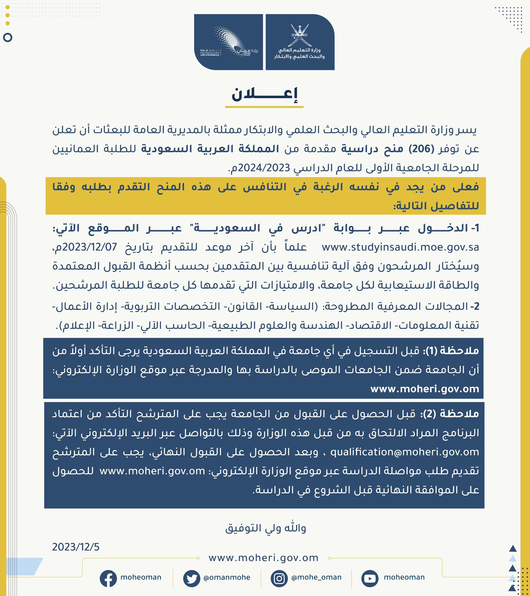 التعليم العالي - توفر (206) منح دراسية مقدمة من المملكة العربية السعودية للطلبة العمانيين للمرحلة الجامعية الأولى للعام الدراسي 2023/2024م.