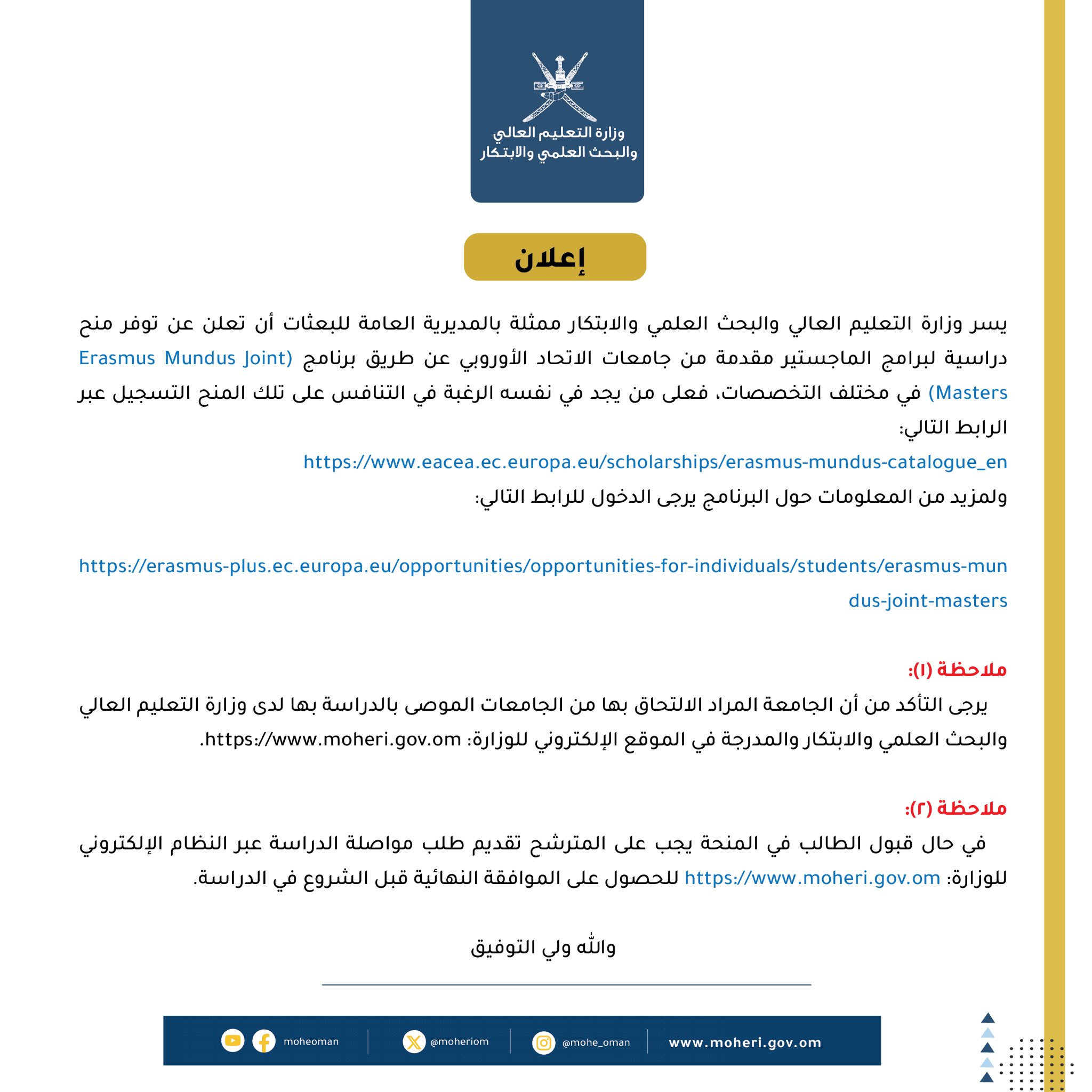 وزارة التعليم العالي والبحث العلمي والابتكار ممثلة بالمديرية العامة للبعثات أن تعلن عن توفر منح دراسية لبرامج الماجستير مقدمة من جامعات الاتحاد الأوروبي