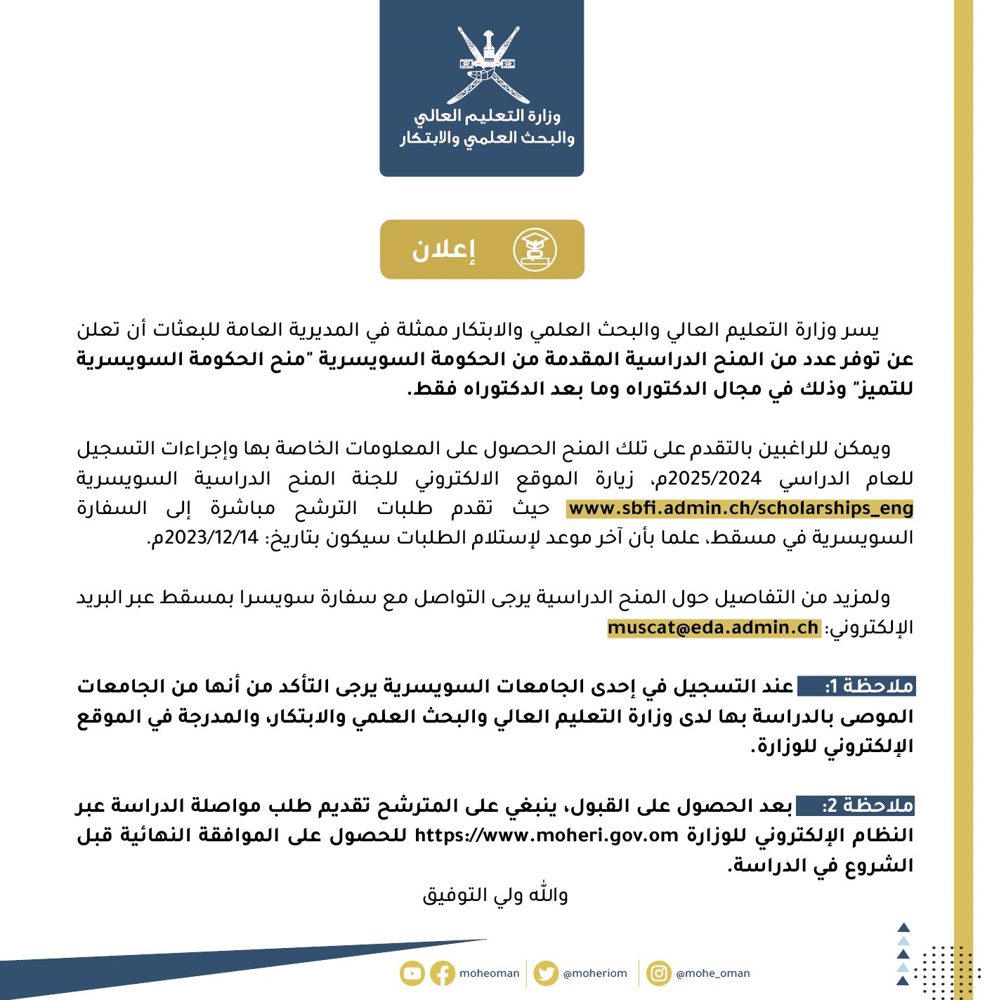 التعليم العالي - اعلان منح سويسرا للعام 2024-2025م
