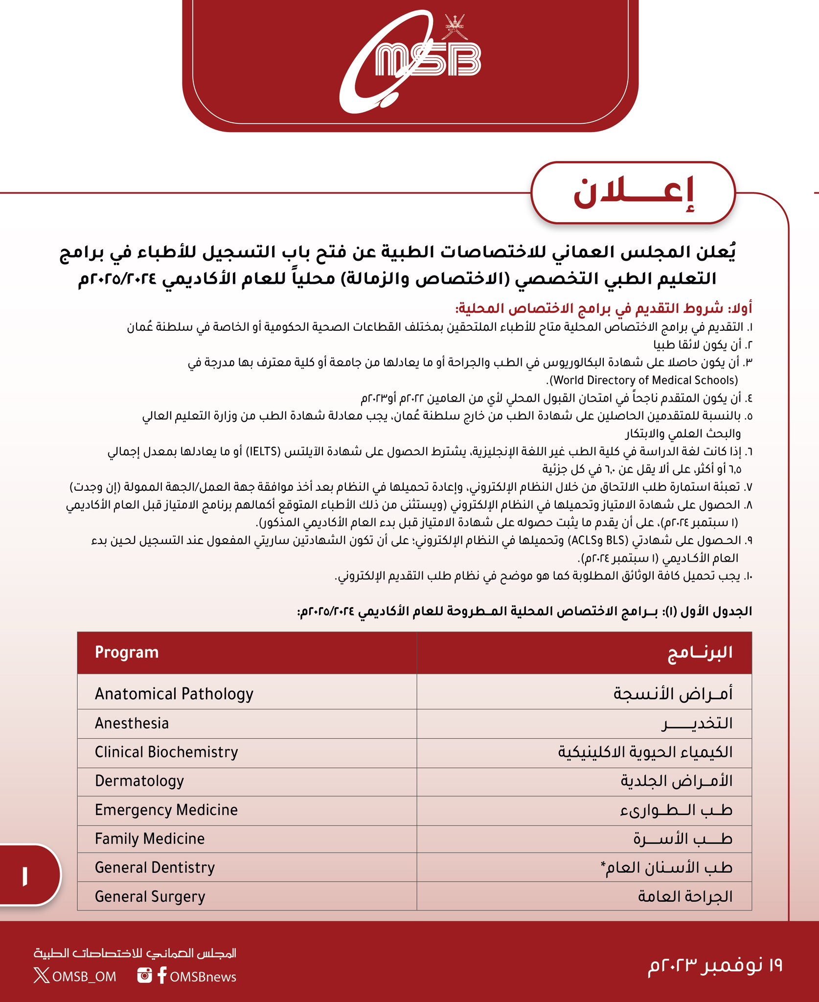 المجلس العماني للاختصاصات الطبية - فتح باب التسجيل للأطباء للالتحاق ببرامج التعليم الطبي التخصصي (الاختصاص والزمالة)