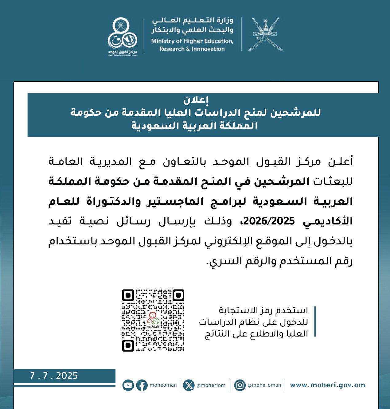 مركز القبول الموحد - إعلان للمرشحين لمنح الدراسات العليا المقدمة من حكومة المملكة العربية السعودية