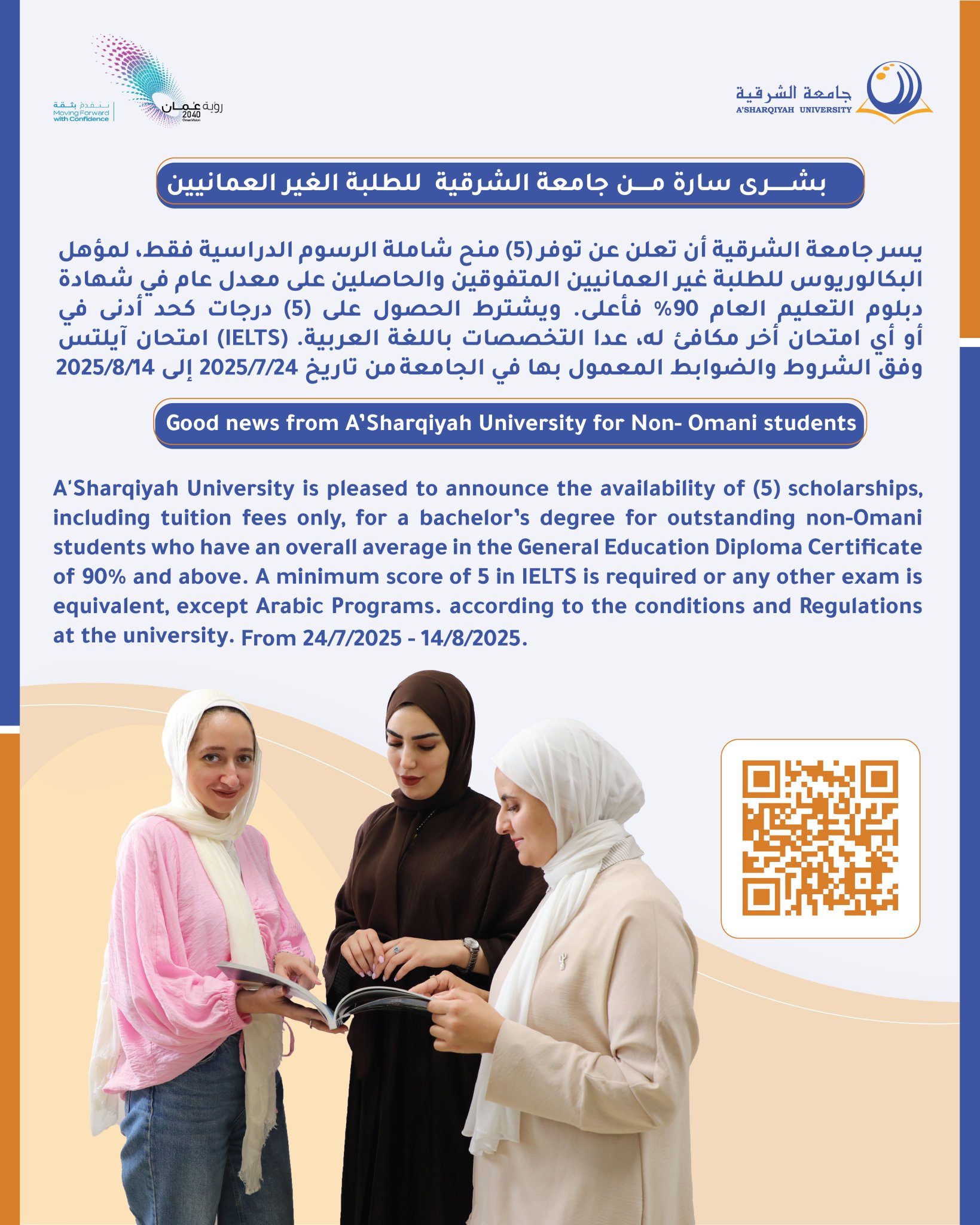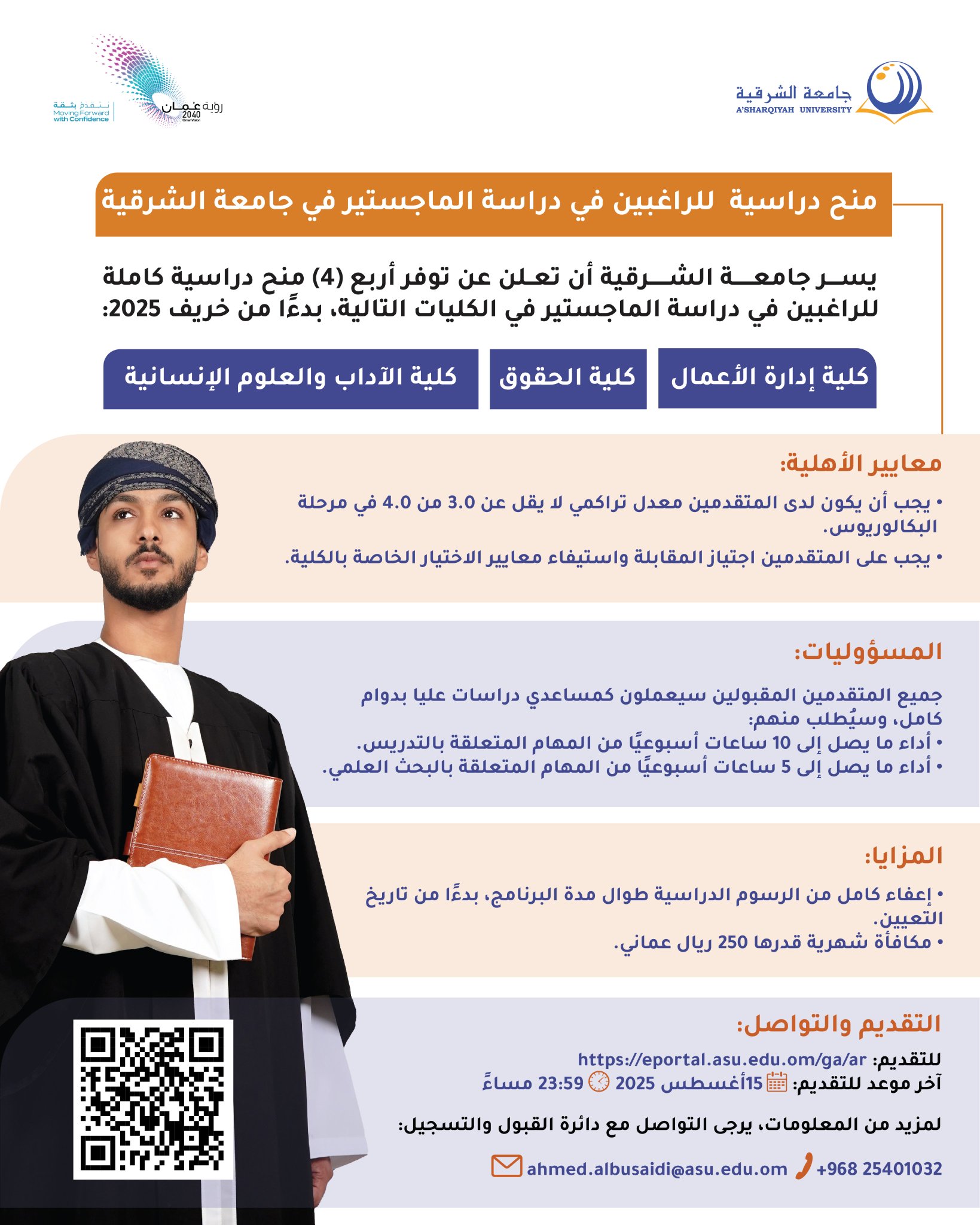 جامعة الشرقية - توفر 5 منح دراسية كاملة (تشمل الرسوم الدراسية فقط) للطلبة العمانيين وغير العمانيين
