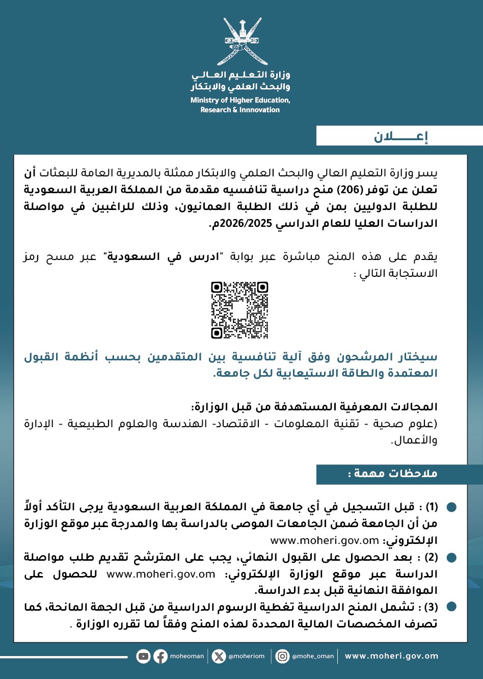 وزارة التعليم العالي والبحث العلمي والابتكار - إعلان عن توفر 206 منح دراسية مقدمة من المملكة العربية السعودية