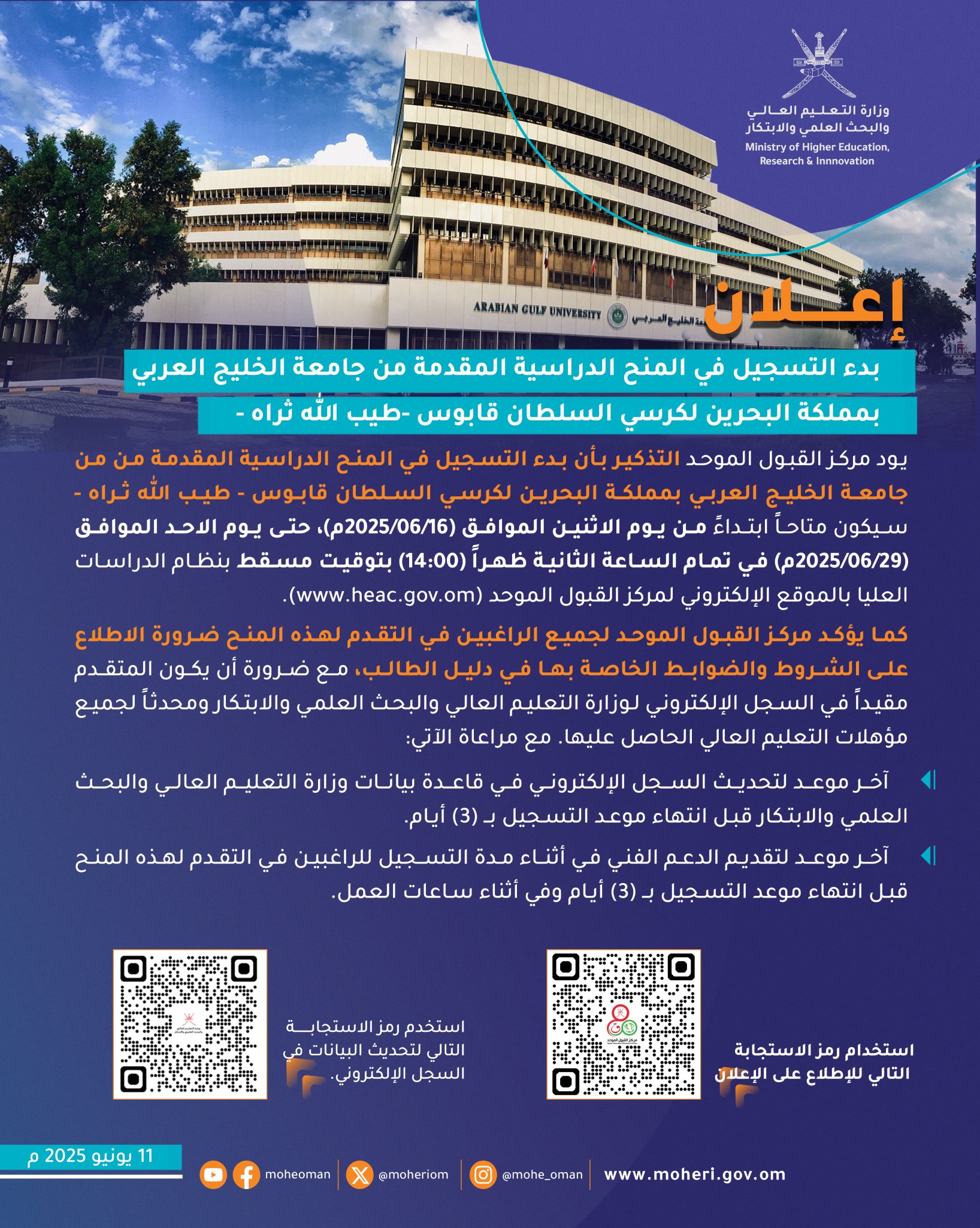 مركز القبول الموحد - بدء التسجيل في المنح الدراسية المقدمة من جامعة الخليج العربي بمملكة البحرين لكرسي السلطان قابوس - طيب الله ثراه