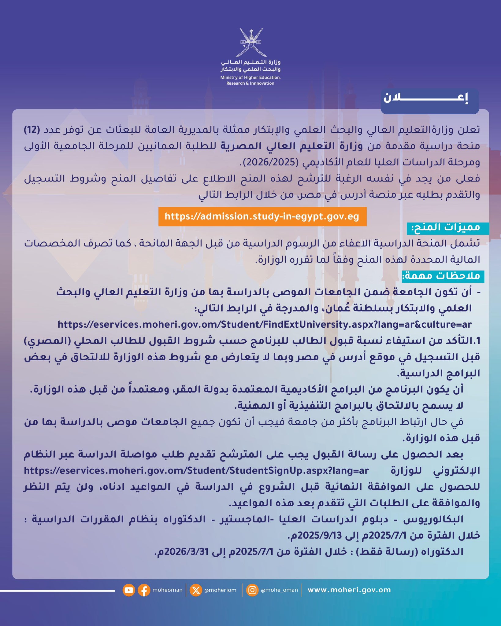 وزارة التعليم العالي والبحث العلمي والابتكار - اعلان عن توفر 12 منحة دراسية مقدمة من وزارة التعليم المصرية