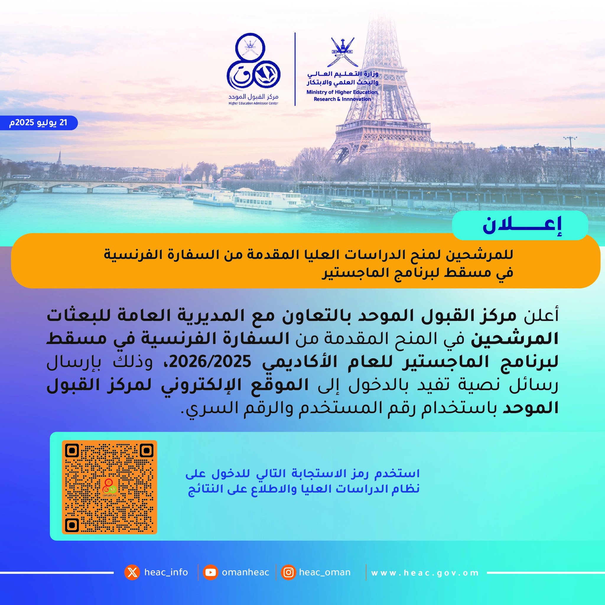 وزارة التعليم العالي والبحث العلمي والابتكار - إعلان للمترشحين لمنح الدراسات العليا المقدمة من السفارة الفرنسية في مسقط برنامج الماجستير