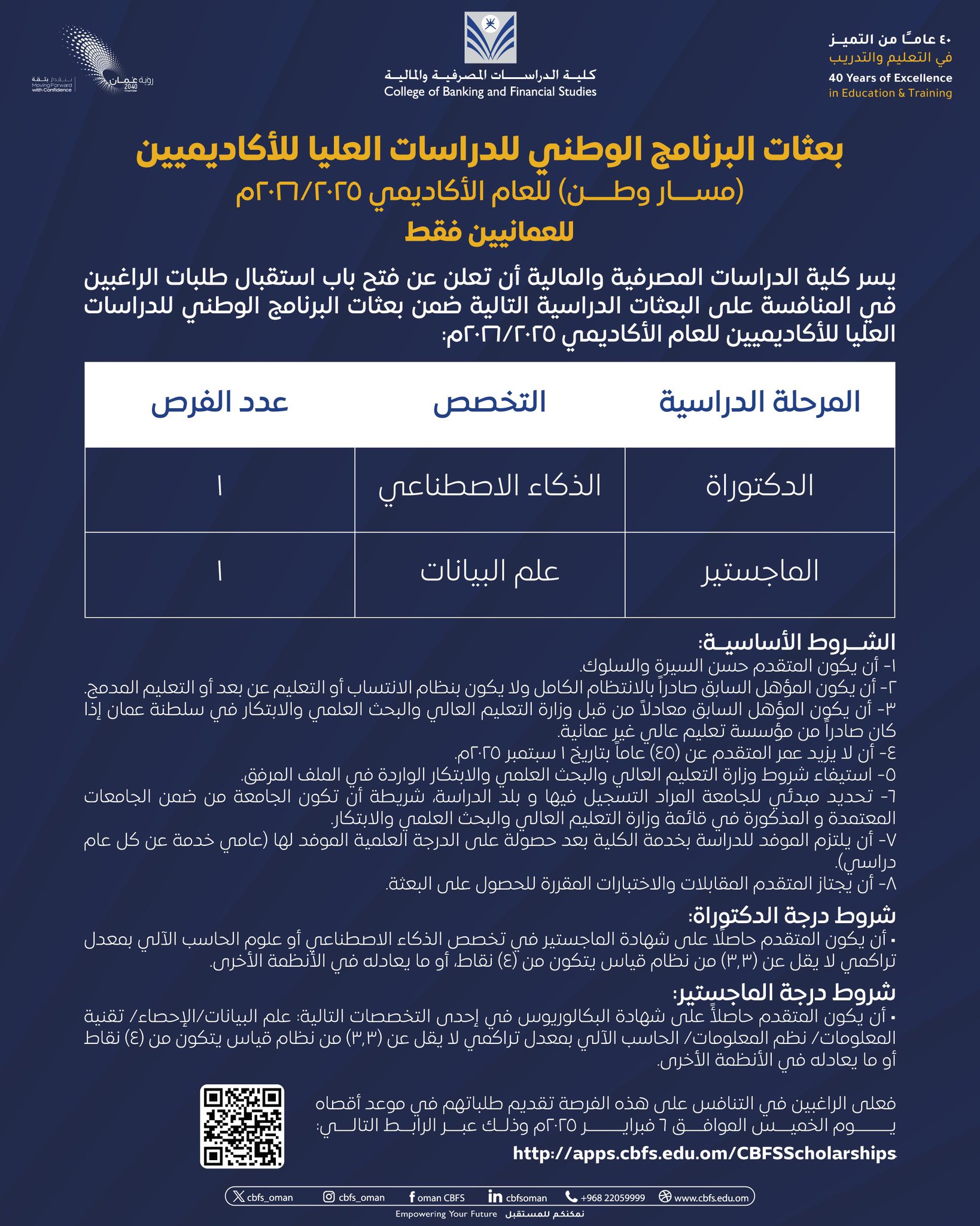 كلية الدراسات المصرفية والمالية - تعلن عن فتح باب التسجيل في البرنامج الوطني للدراسات العليا للأكاديميين