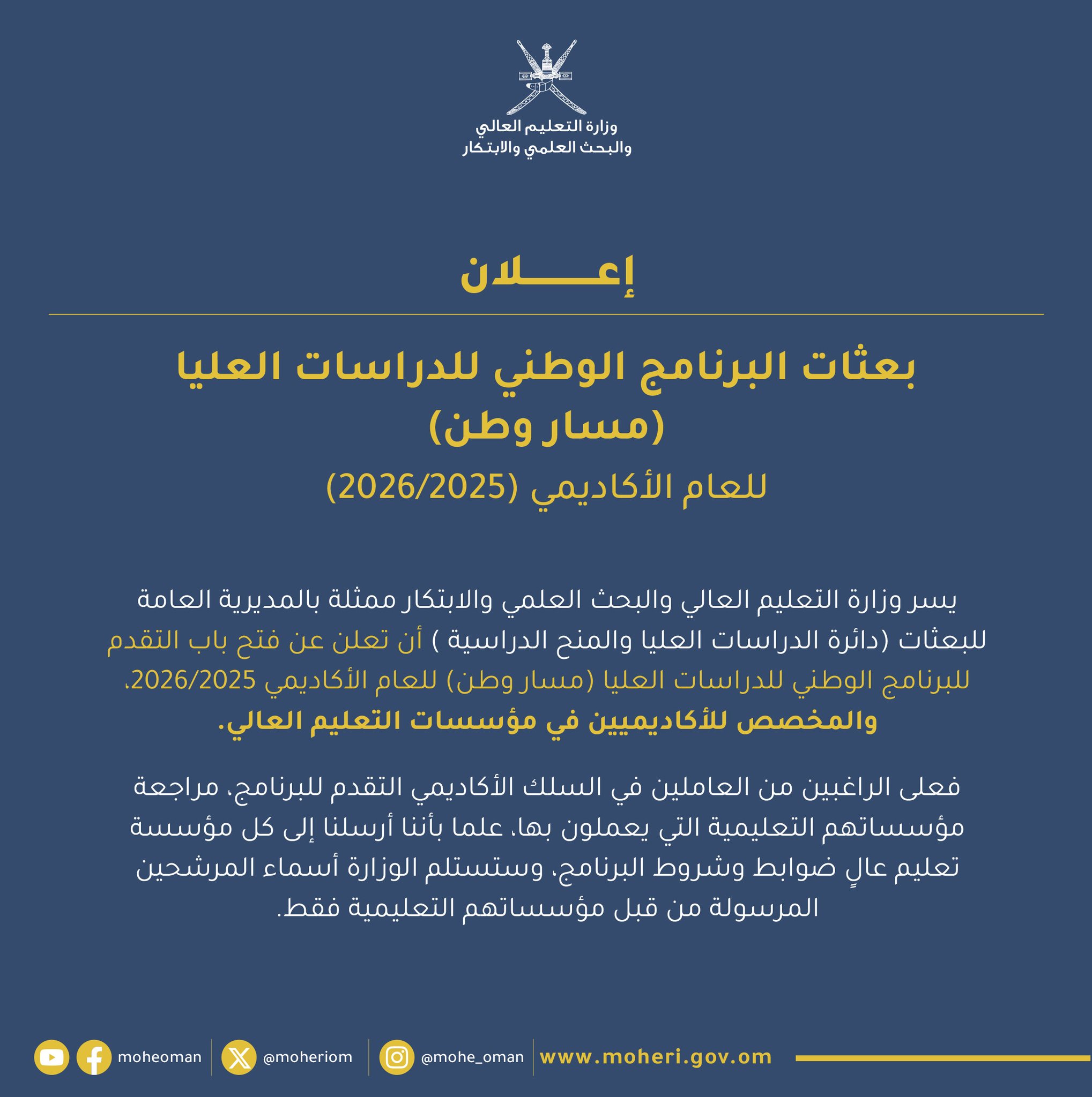 وزارة التعليم العالي والبحث العلمي والابتكار - بعثات البرنامج الوطني للدراسات العليا (مسار وطن)