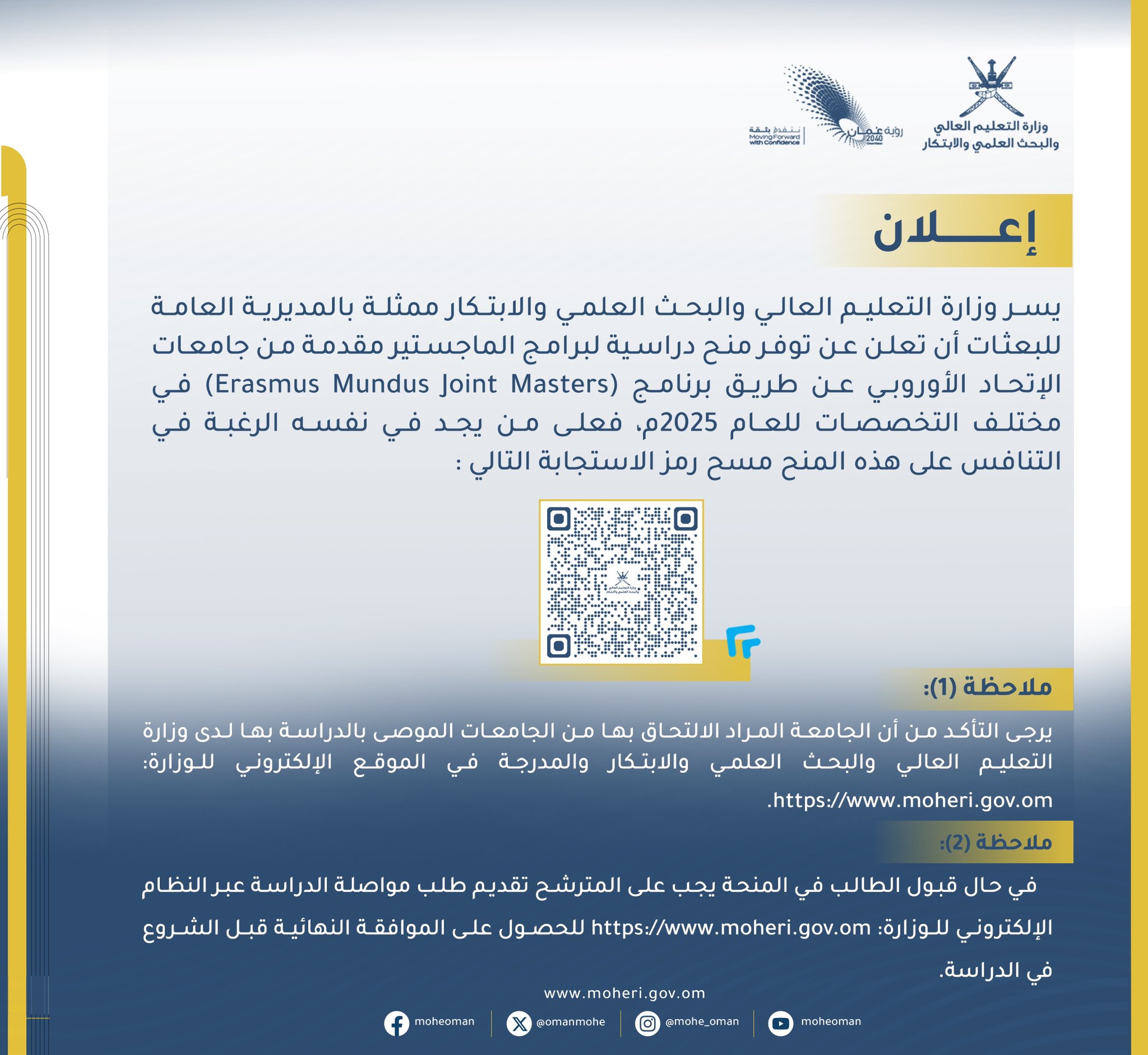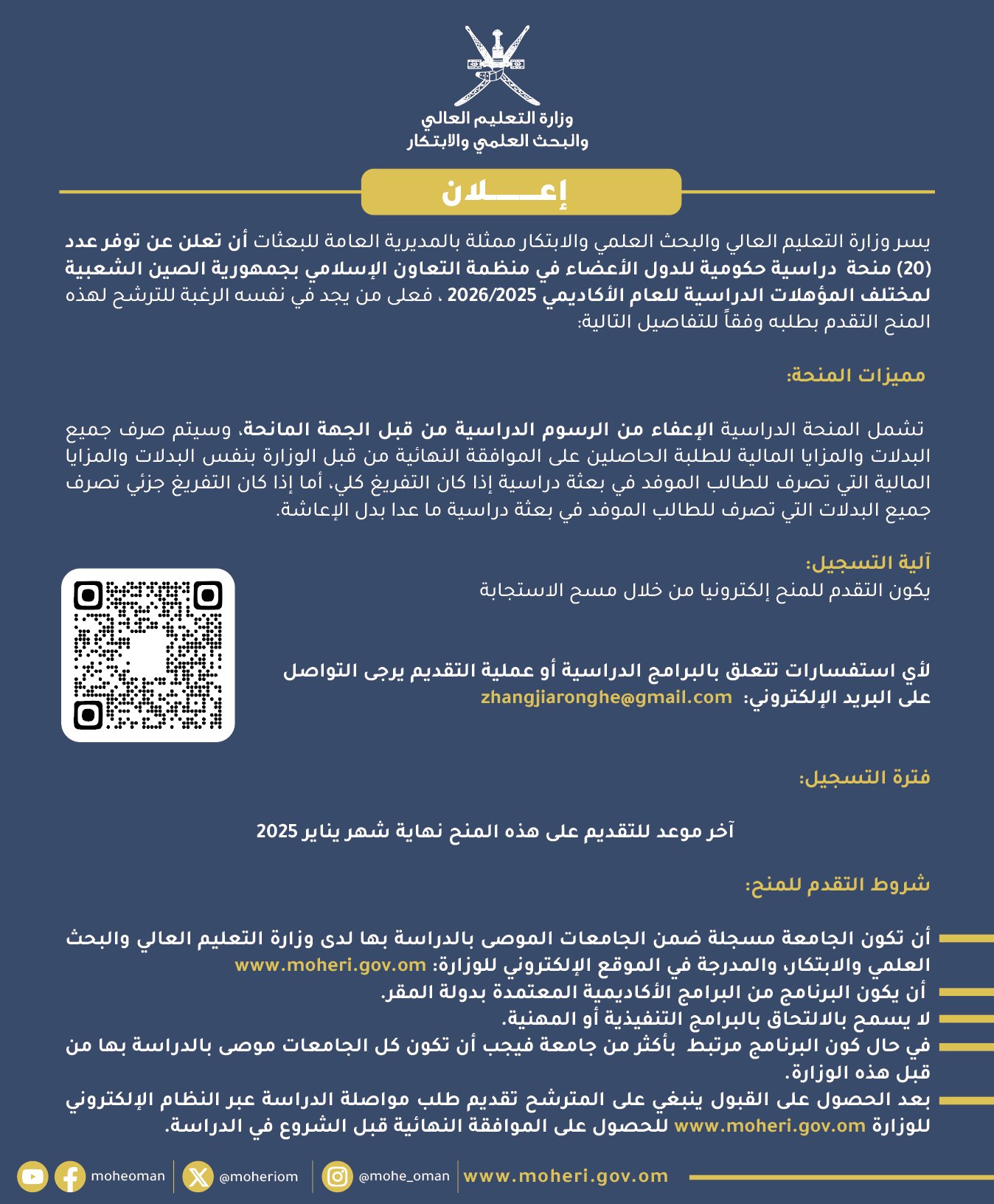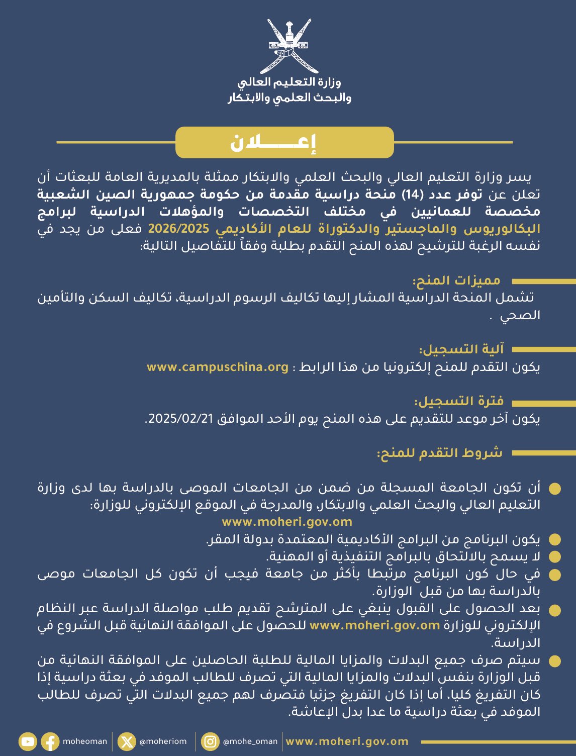وزارة التعليم العالي والبحث العلمي والابتكار - توفر عدد (14) منحة دراسية مقدمة من حكومة جمهورية الصين الشعبية مخصصة للعمانيين في مختلف التخصصات والمؤهلات الدراسية لبرامج البكالوريوس والماجستير والدكتوراة