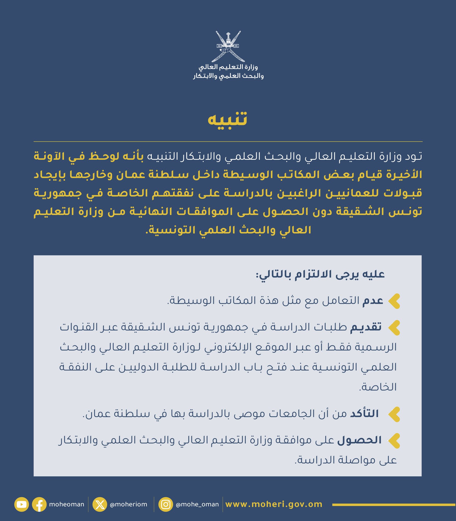 وزارة التعليم العالي والبحث العلمي والابتكار - تنبيه مهم للراغبين بالدراسة على نفقتهم الخاصة في جمهورية تونس