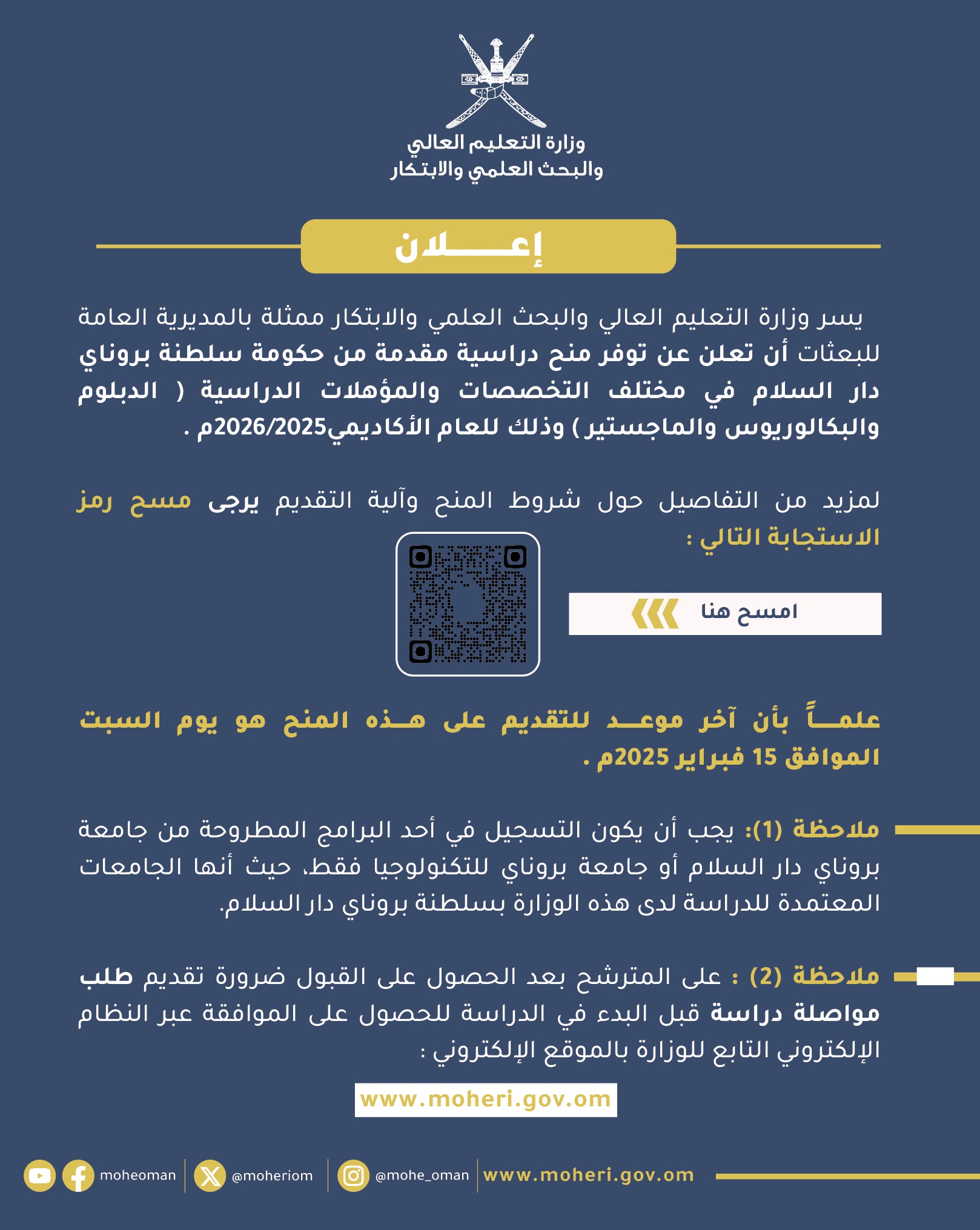 وزارة التعليم العالي والبحث العلمي العلمي والابتكار - منح دراسية مقدمة من حكومة سلطنة بروناي دار السلام في مختلف التخصصات والمؤهلات الدراسية