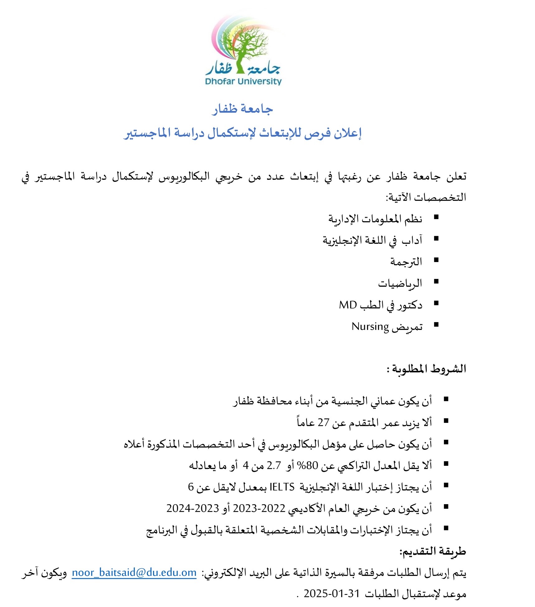 جامعة ظفار - اعلان فرص للابتعاث لاستكمال دراسة الماجستير في عدد من التخصصات