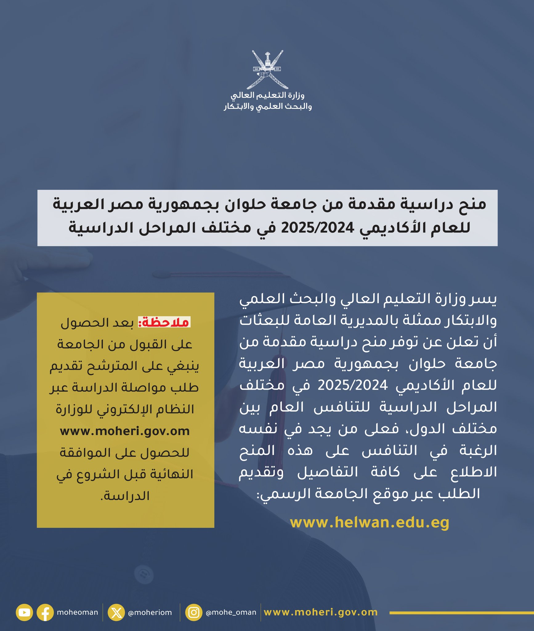 وزارة التعليم العالي - منح دراسية مقدمة من جامعة حلوان بجمهورية مصر