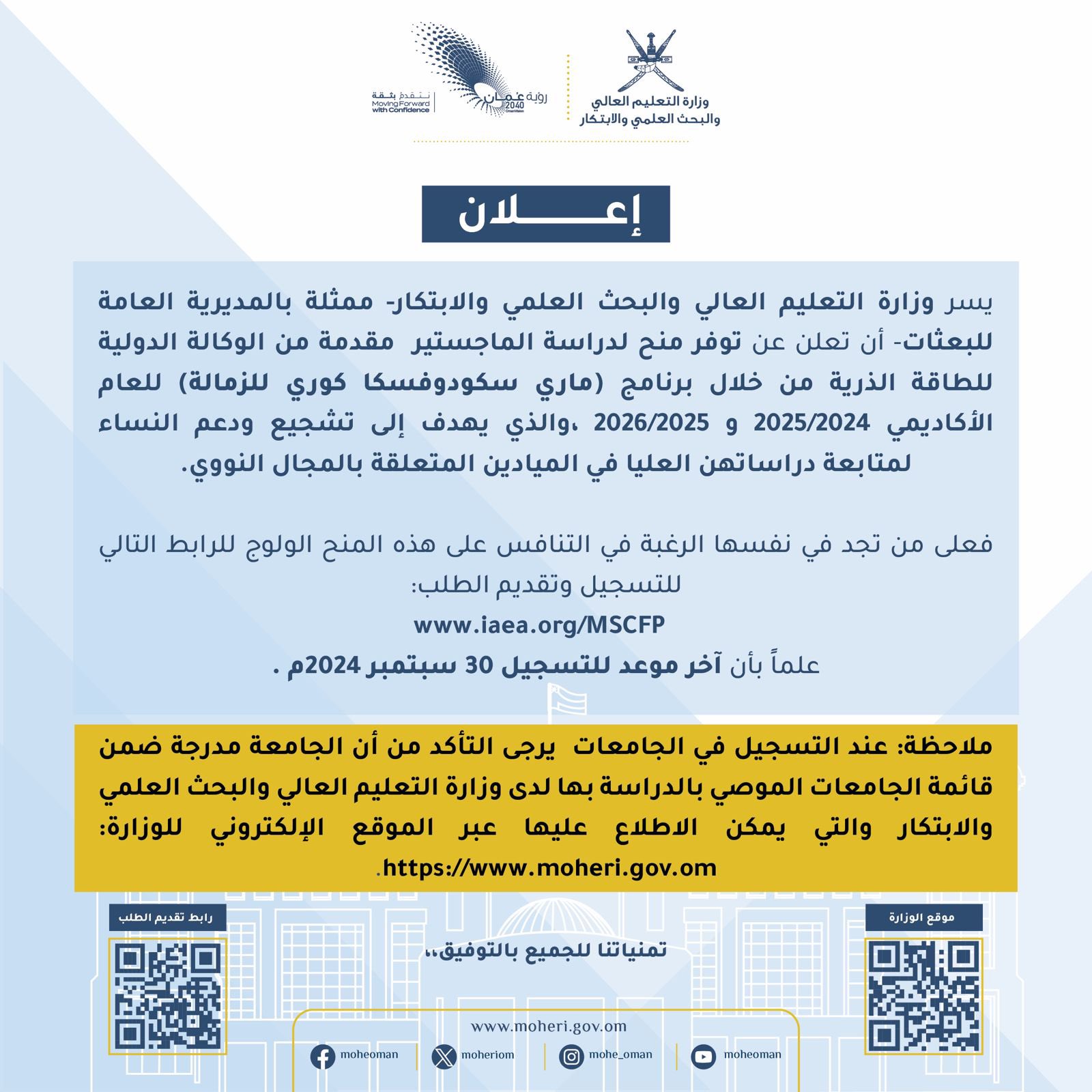 وزارة التعليم العالي والبحث العلمي والابتكار - منح دراسية مقدمة من الوكالة الدولية للطاقة الذرية