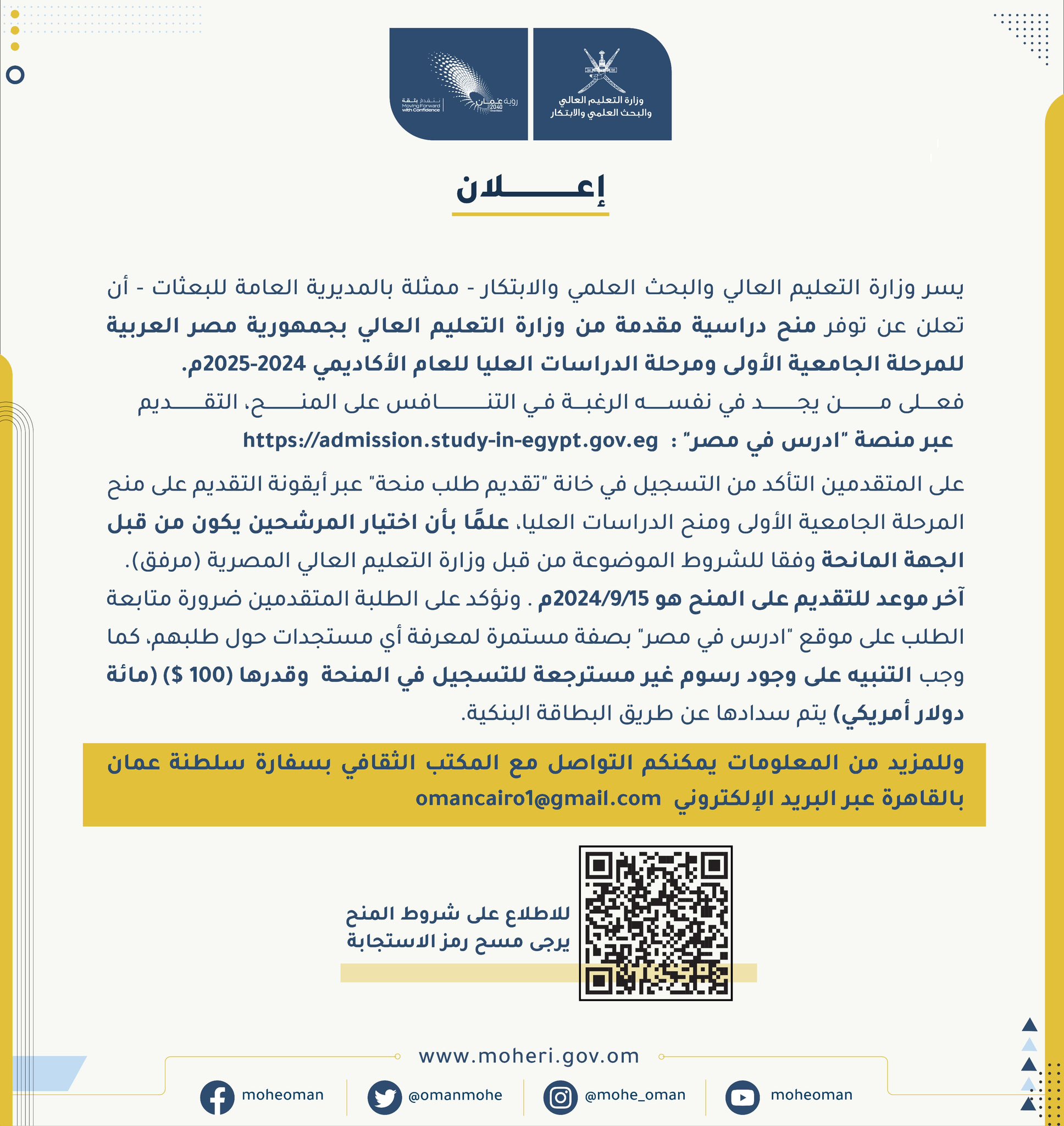 وزارة التعليم العالي - منح دراسية مقدمة من جمهورية مصر العربية