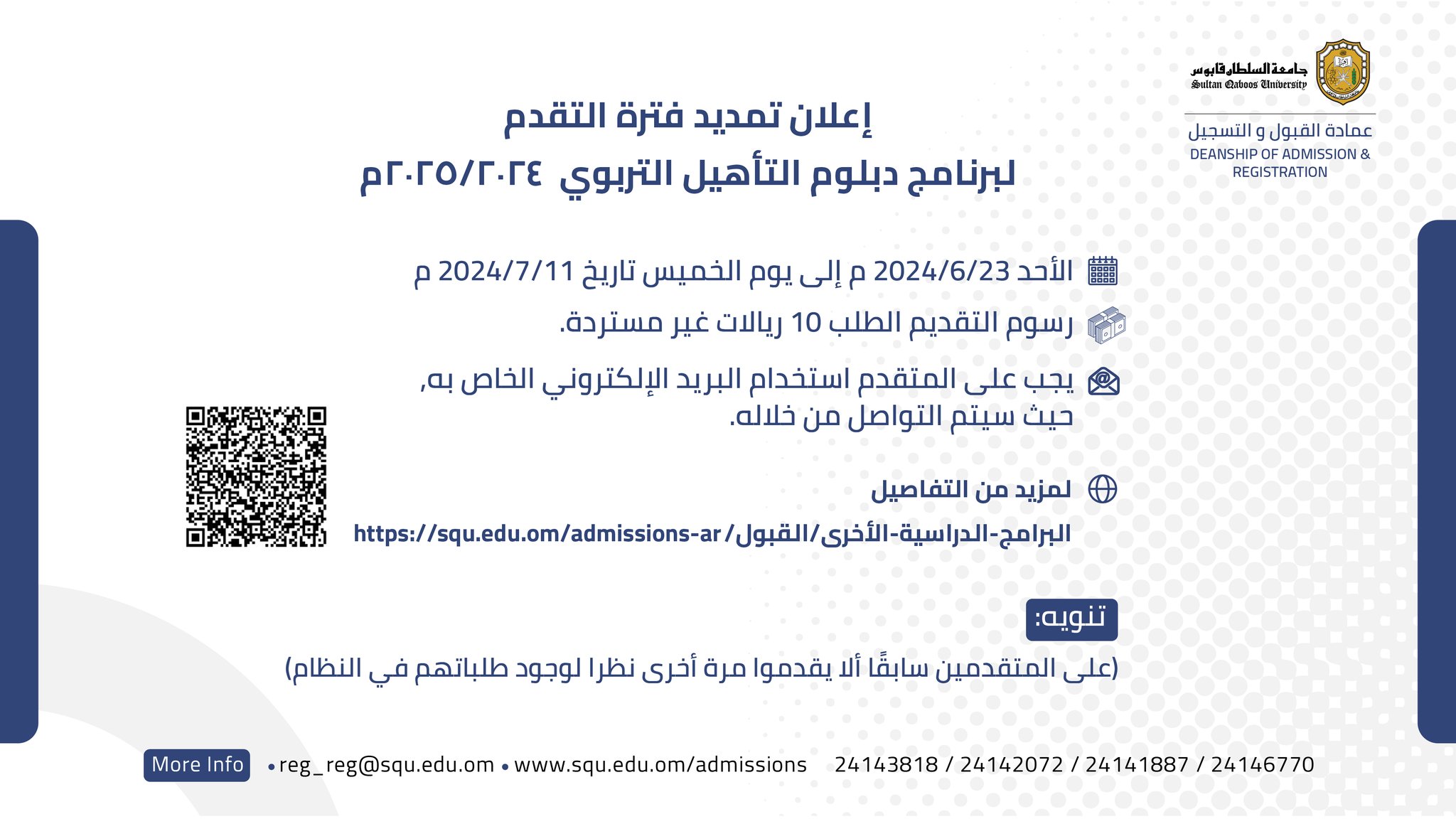 جامعة السلطان قابوس - تمديد فترة التقدم للالتحاق ببرنامج دبلوم التأهيل التربوي للعام الأكاديمي 2024/2025م