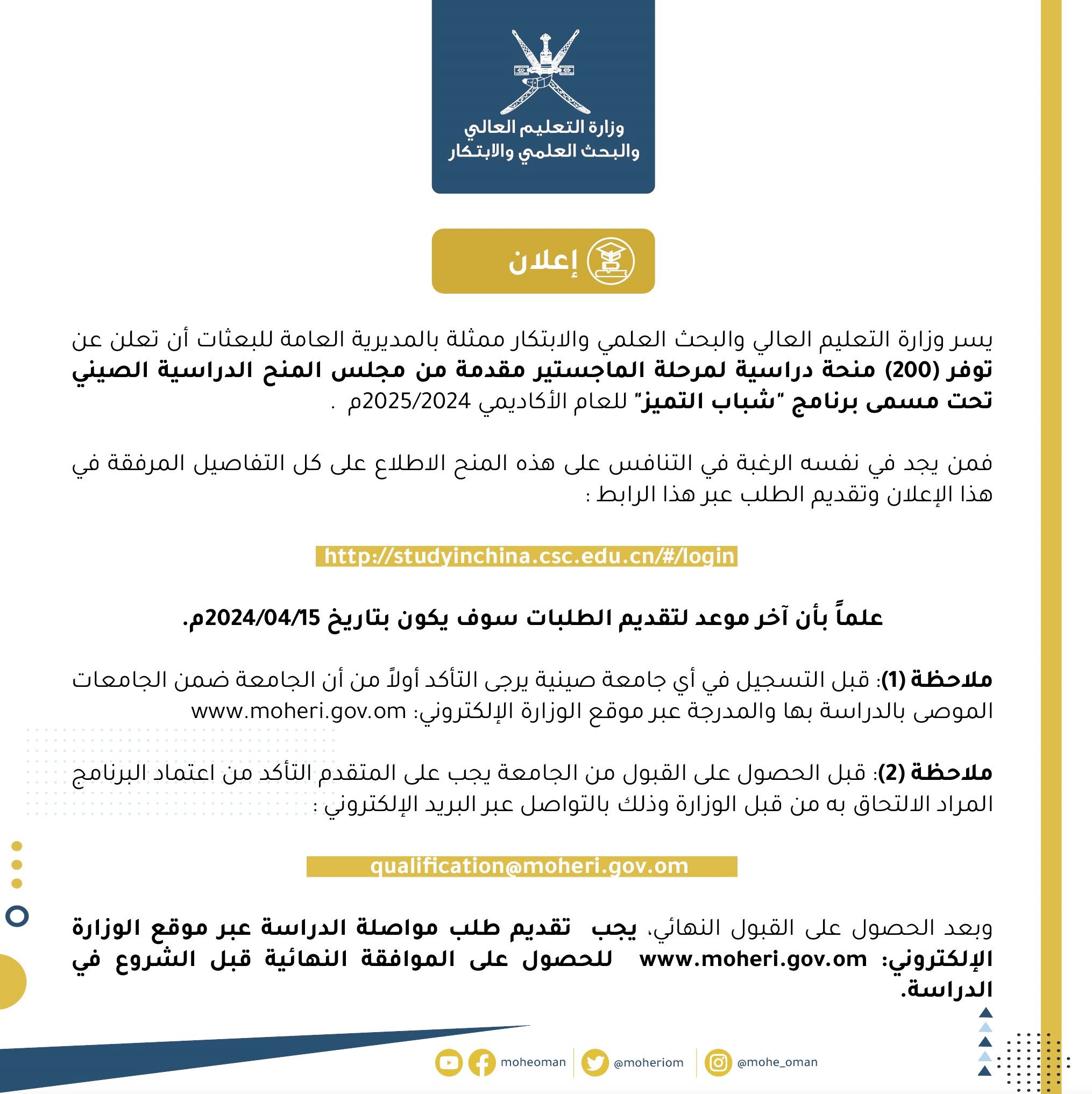 التعليم العالي - 200 منحة دراسية لمرحلة الماجستير مقدمة من مجلس المنح الدراسية الصيني للعام الأكاديمي 2025/2024م.