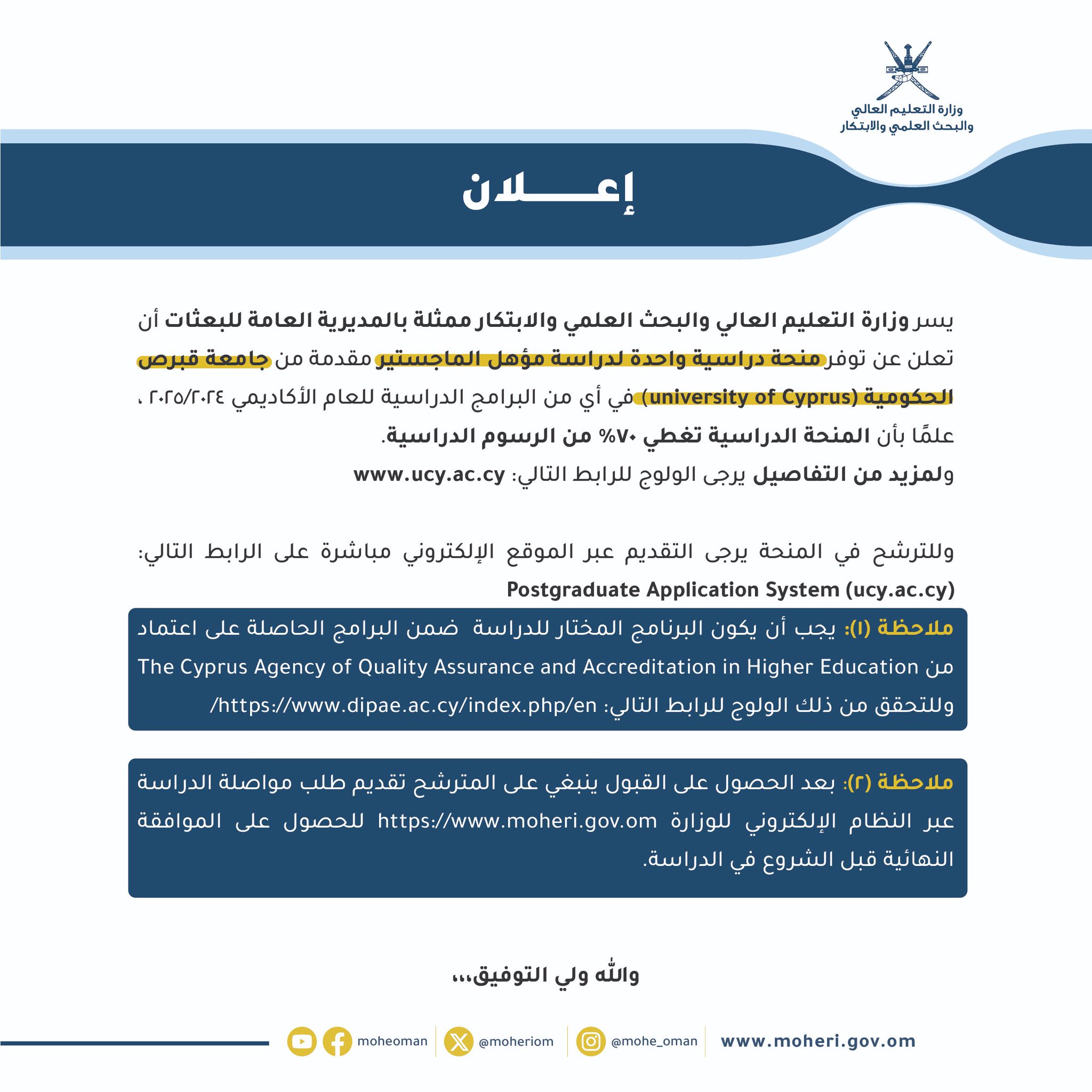 التعليم العالي - إعلان عن ثلاث منح مقدمة من جمهورية قبرص