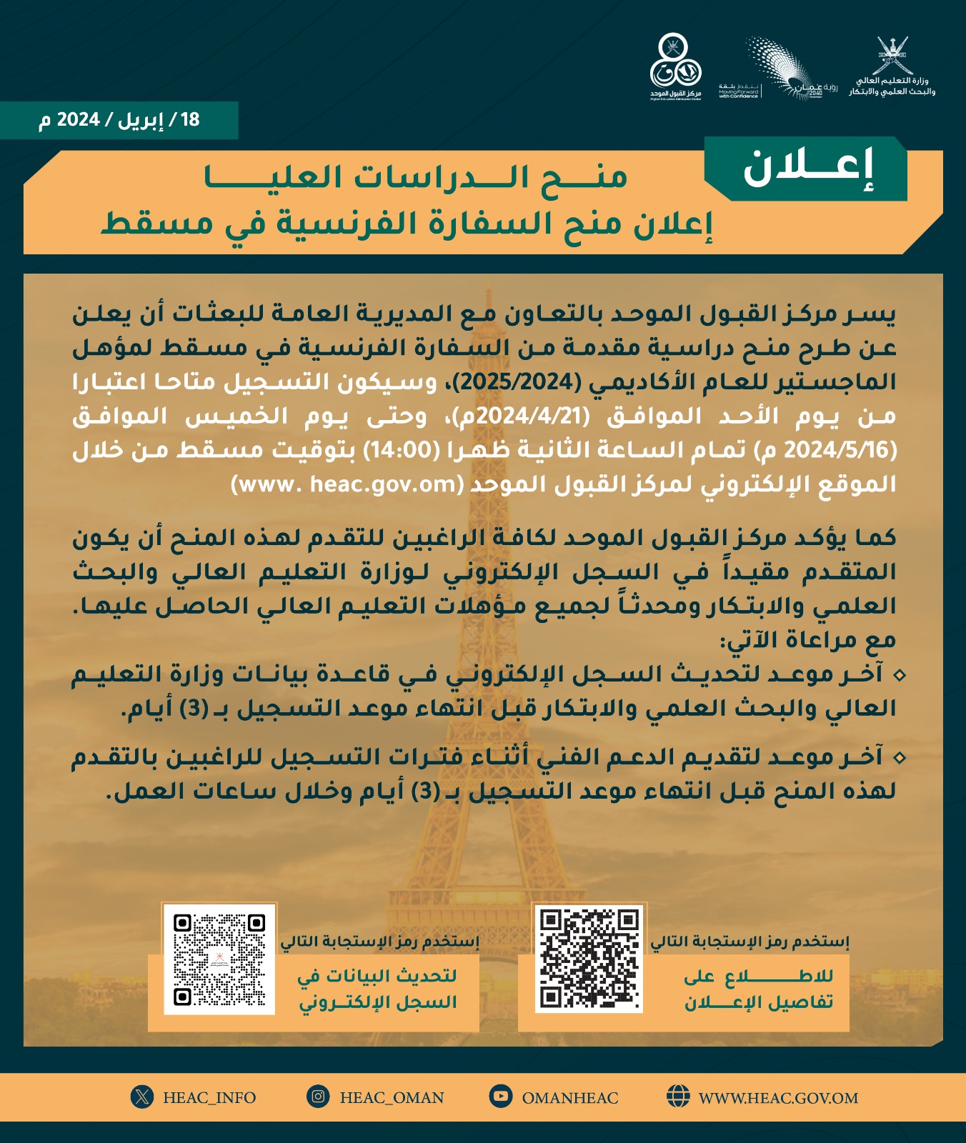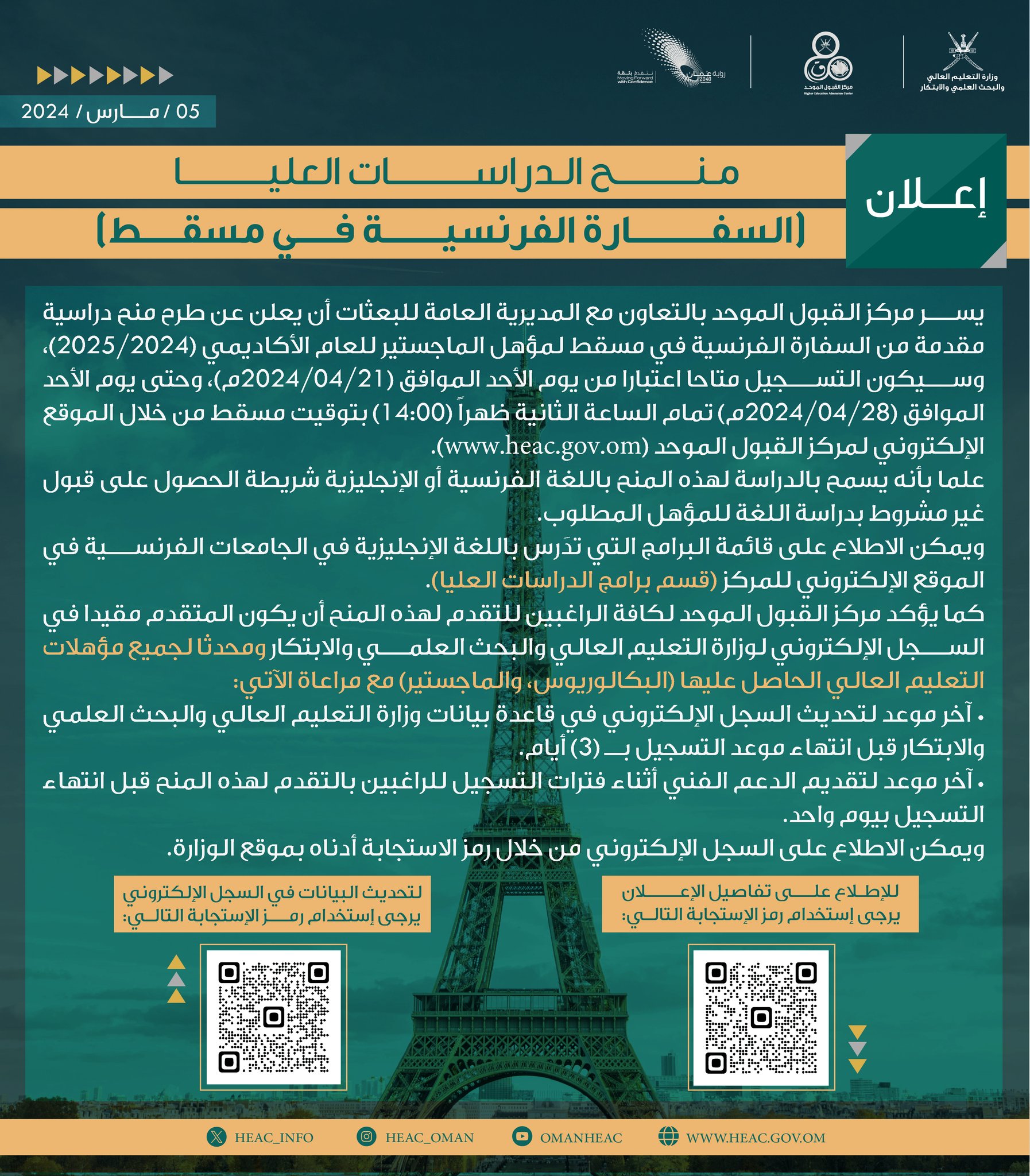 مركز القبول الموحد - طرح منح دراسية مقدمة من السفارة الفرنسية في مسقط