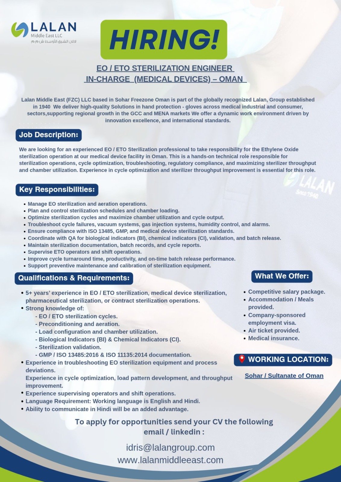 شركة لالان الشرق الأوسط في صحار - وظيفة شاغرة ( EO/ETO STERILIZATION ENGINEER )