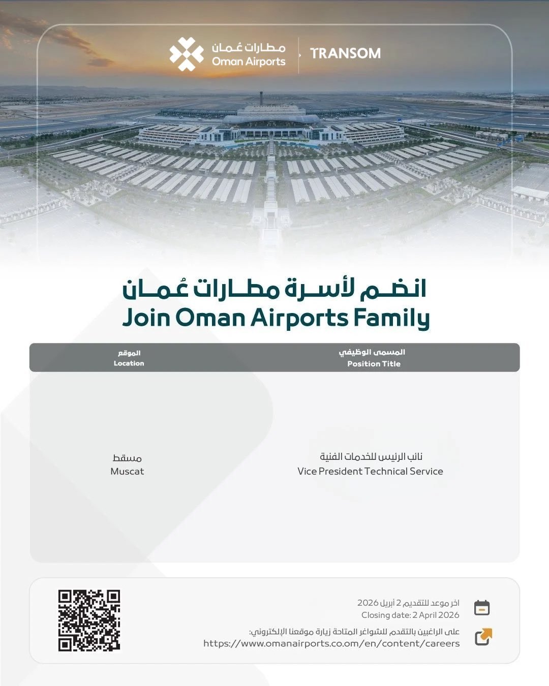 مطارات عمان - وظيفة شاغرة ( نائب الرئيس للخدمات الفنية )