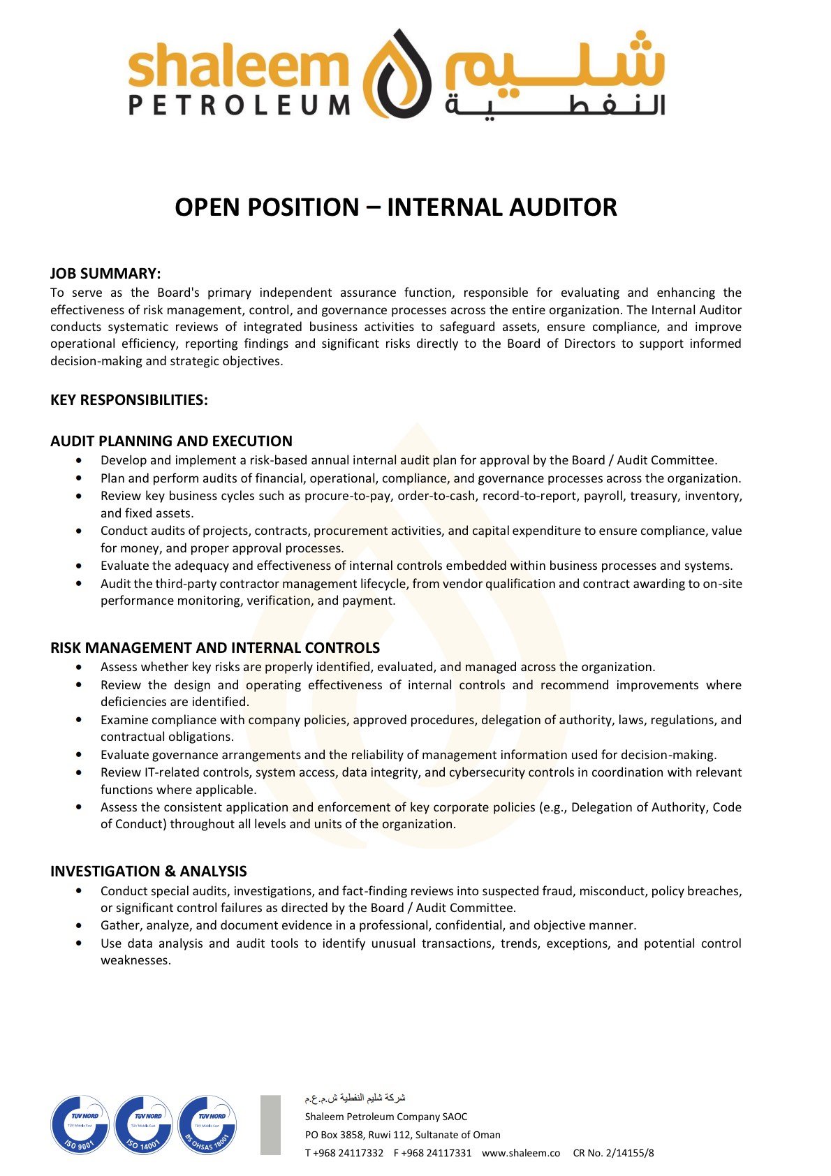 شركة شليم النفطية - وظيفة شاغرة ( INTERNAL AUDITOR )